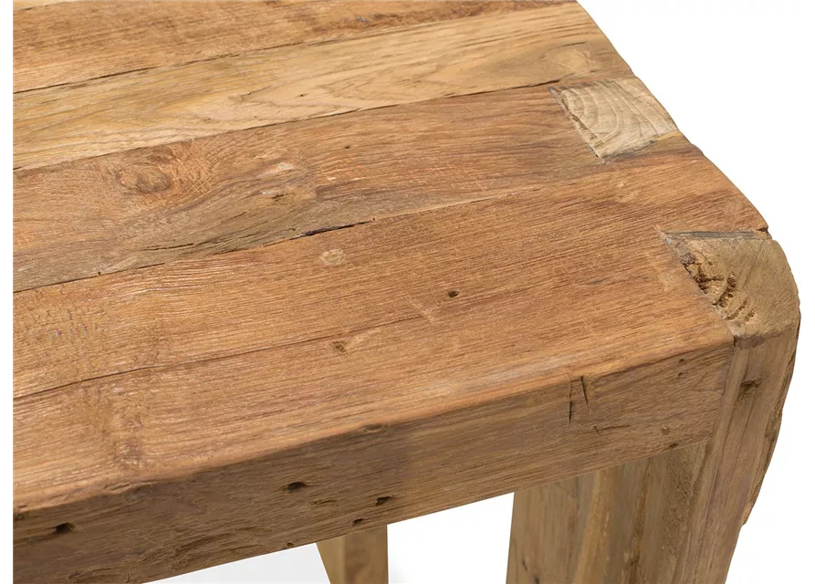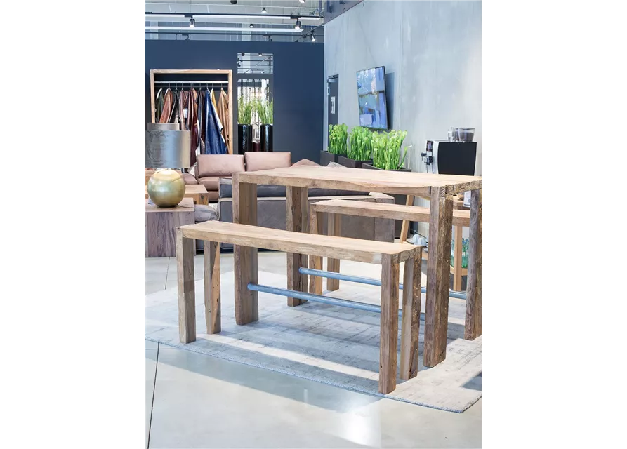 Wer auf der Suche nach einer alternativen Möblierung für Balkon, Garten und Terrasse ist, wird mit dem modernen, schlicht geformten Stehtisch HAPPY HOUR eine tolle Lösung finden. Der stabile, zinkenverleimte Tisch ist aus recyceltem, 6 cm starkem Teakholz gefertigt, das mit seiner rustikalen Optik punktet. Um den Vintage-Touch zu unterstreichen und die Maserung der Holzes zu betonen, ist das Holz zusätzlich gebürstet. Im Außenbereich kann es zu Rissbildung kommen, die aber keinen Mangel darstellt, sondern den Look erst richtig authentisch macht. Bei Verwendung im Außenbereich empfehlen wir die Behandlung mit GOLDEN CARE Teak Imprägnierung (#19887) gegen Verwitterung. Die Fußablage ist aus einem runden, verzinkten Eisenrohr gefertigt und garantiert Stabilität. Und wenn Sie doch einmal in einer gemütlichen Runde beisammen sitzen möchten, ist die HAPPY HOUR Sitzbank (Art. 21473) die perfekte Ergänzung.