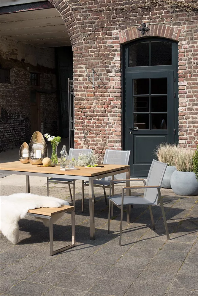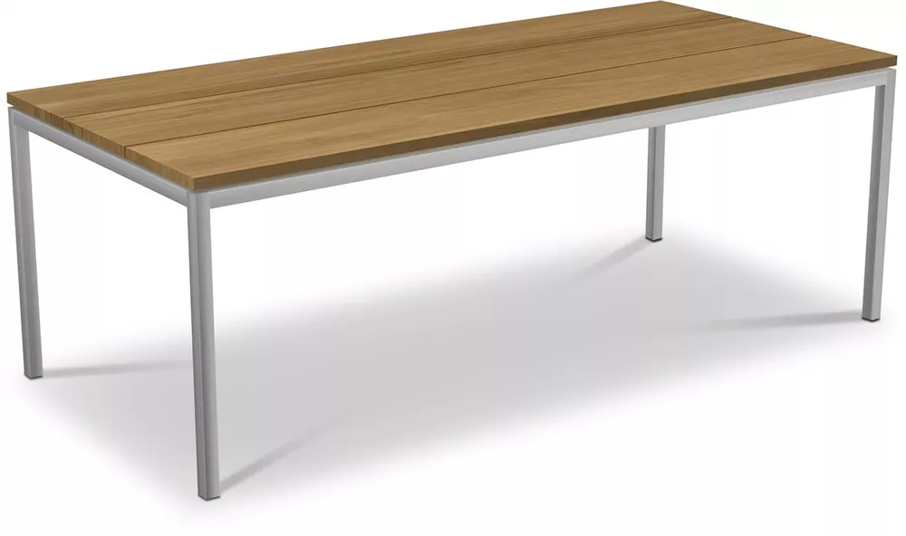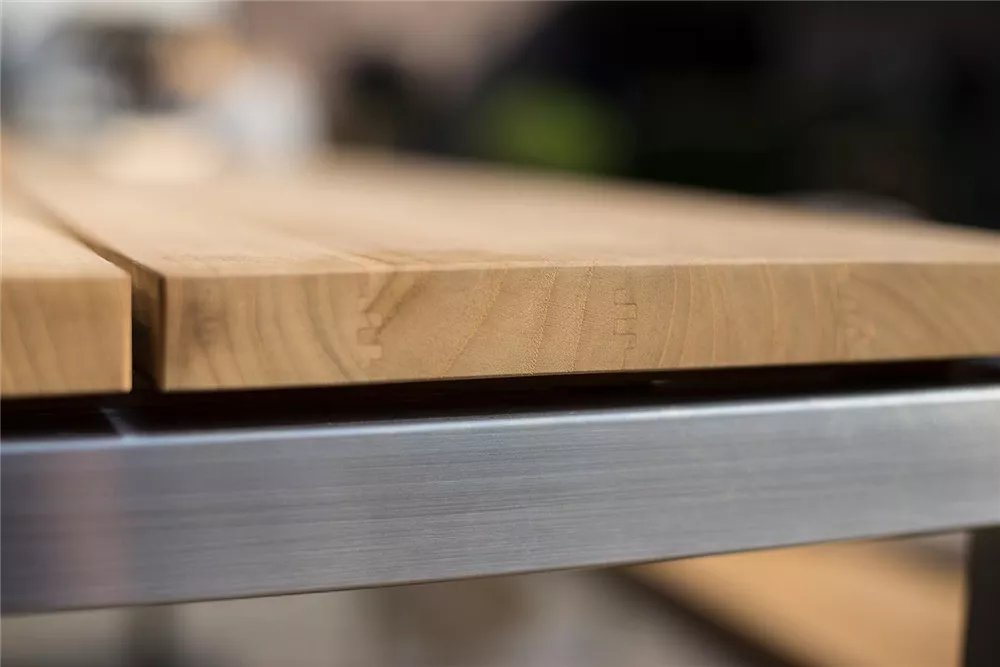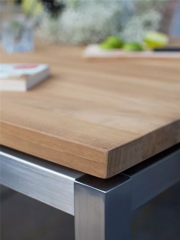 TIMBER kombiniert modernes Design mit hochwertigen Materialien und bietet 8 Personen Platz. Die schlichte, reduzierte Formgebung lenkt den Fokus auf die Materialauswahl: die Tischplatte ist aus massivem Teakholz gefertigt und das Tischgestell besteht aus rostfreiem Edelstahl. Für ein harmonisches Gesamtbild auf Ihrer Terrasse, können Sie den Gartentisch wunderbar mit der passenden TIMBER Gartenbank in 220 Zentimetern Länge kombinieren.