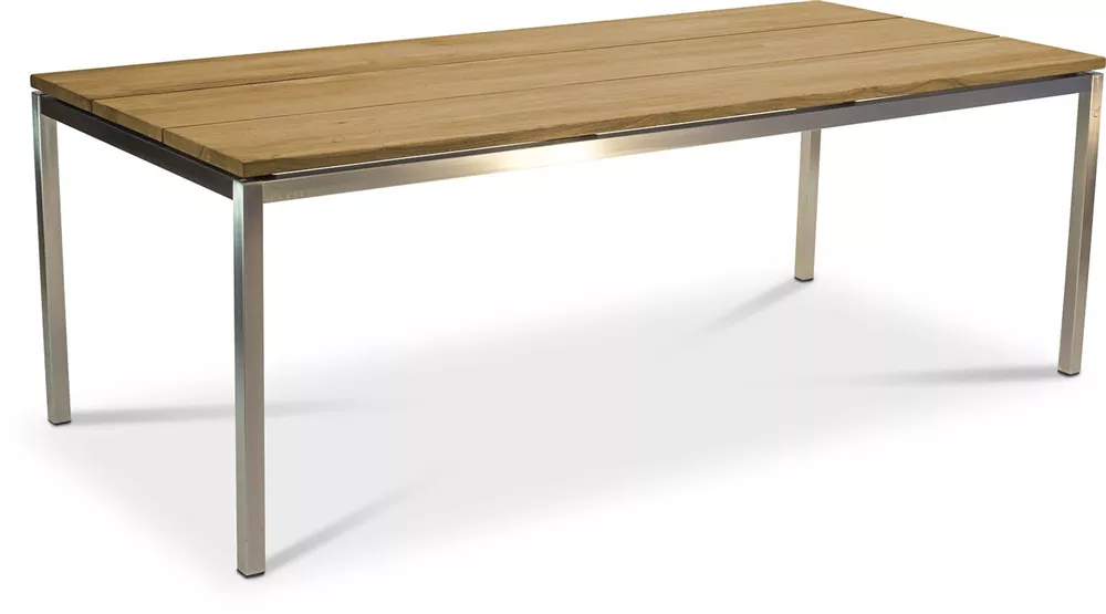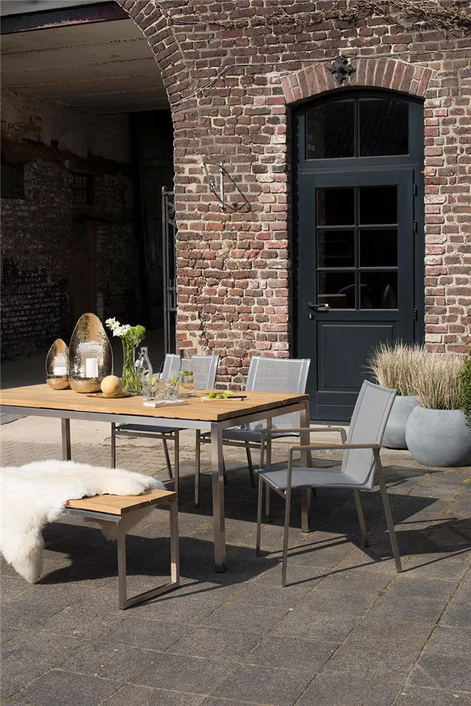 TIMBER kombiniert modernes Design mit hochwertigen Materialien und bietet 6 Personen Platz. Die schlichte, reduzierte Formgebung lenkt den Fokus auf die Materialauswahl: die Tischplatte ist aus massivem Teakholz gefertigt und das Tischgestell besteht aus rostfreiem Edelstahl. Für ein harmonisches Gesamtbild auf Ihrer Terrasse, können Sie den Gartentisch wunderbar mit der passenden TIMBER Gartenbank in 180 Zentimetern Länge kombinieren.