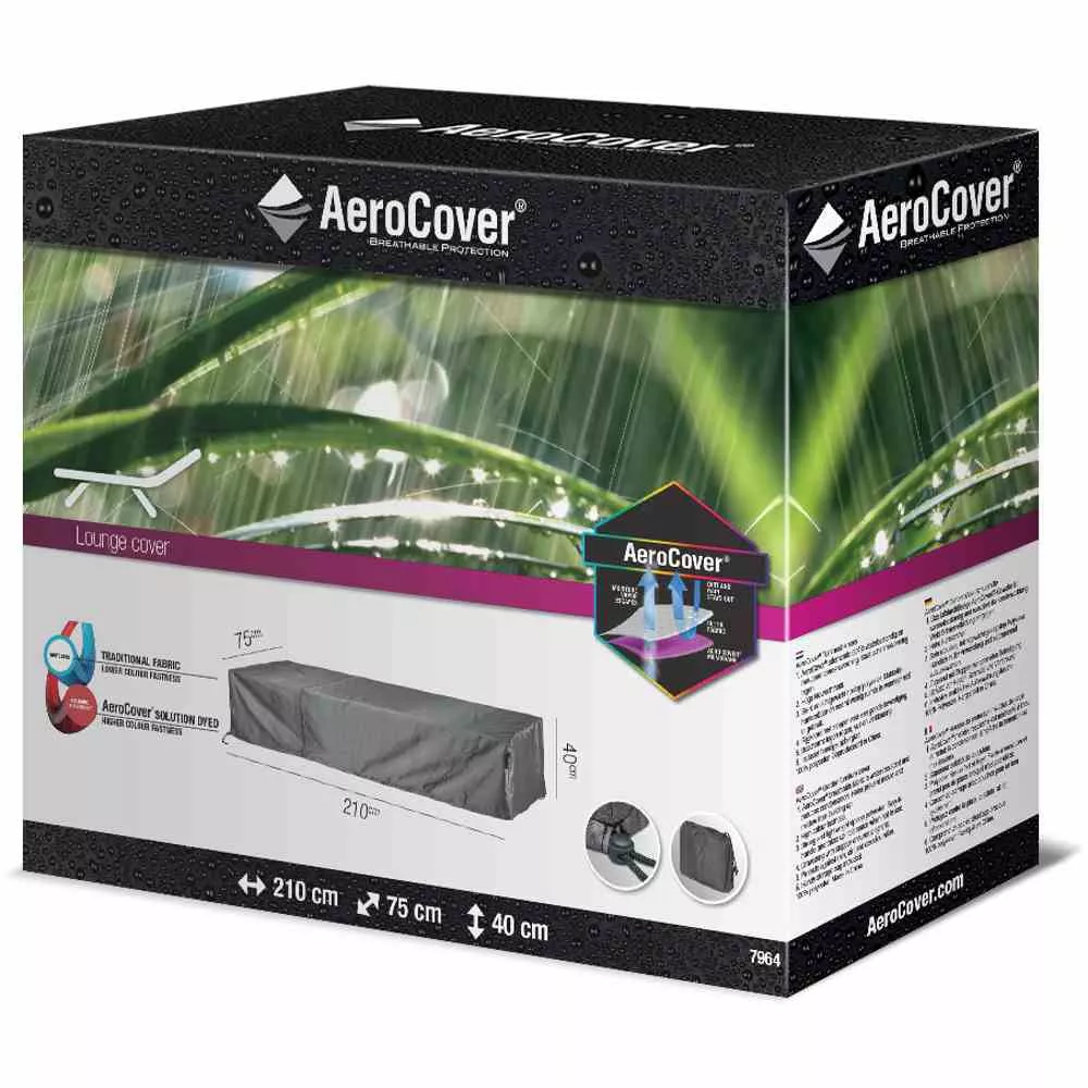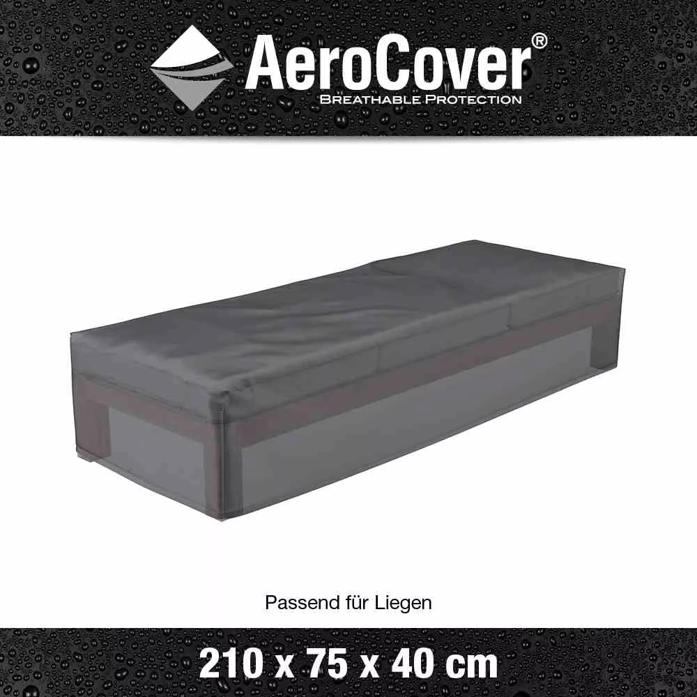 Atmungsaktive Loungeliegen-Hülle 210x75x40 cm passend für Liegen mit einer Länge von bis zu 210 cm. Das atmungsaktive AeroCover-Gewebe ist wasserabweisend und reduziert die Kondensbildung. Zudem sorgt die AeroCover-Membran dafür, dass die Bildung von Mehltau und Schimmel vermieden wird. AeroCover Schutzhüllen verlängern die Lebensdauer Ihrer Gartenmöbel. AeroCovers sind aus leichtem Ripstop Polyester mit einer integrierten, atmungsaktiven Membran hergestellt. Dank des dünnen Gewebes sind diese Hüllen besonders handlich in der Anwendung. Bei Nichtgebrauch sind sie platzsparend aufzubewahren und nehmen, auch dank der integrierten Aufbewahrungstasche, sehr wenig Platz ein. Die Hülle ist mit einem Zugband mit zwei Stoppern ausgestattet, so dass eine optimale Befestigung sichergestellt ist.Das AeroCover-Gewebe ist 100% wasserdicht, die Nähte sind spritzwasserfest.