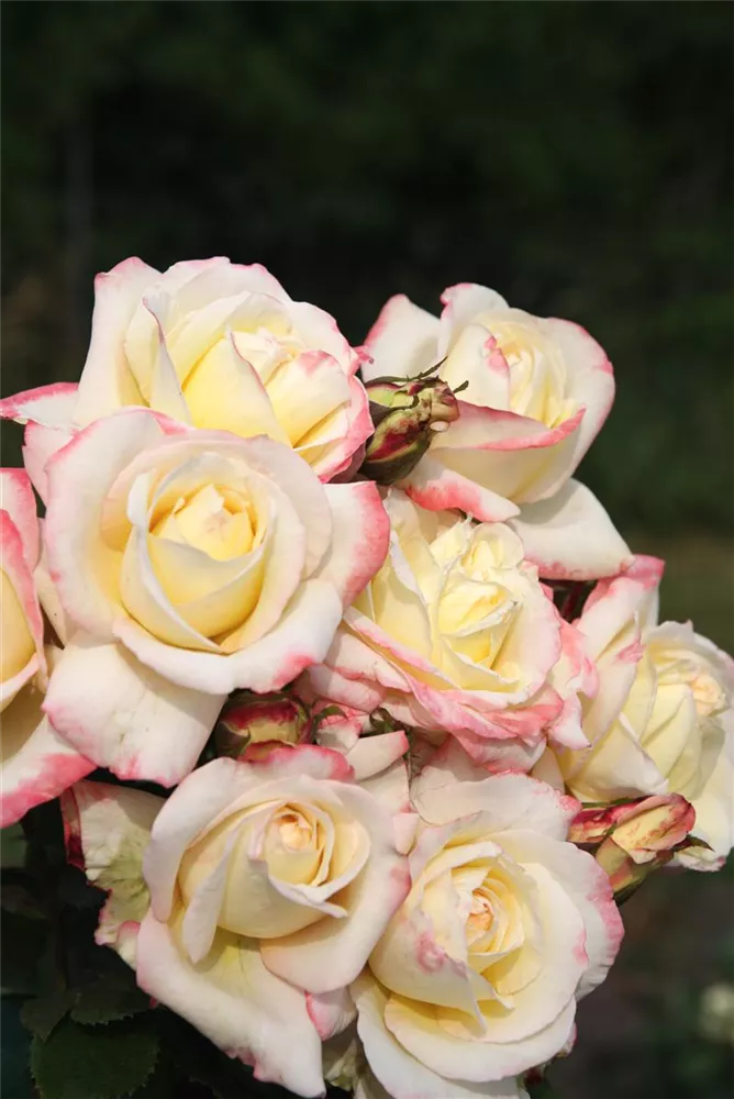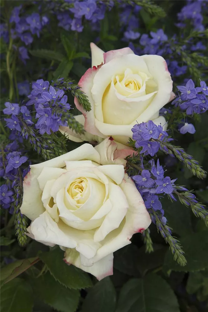 Die Edelrose 'Athena'® (Rosa) ist eine reichblühende Rose, die im Garten eine besondere Rolle spielt. Die zahlreichen gefüllten Blüten sind cremeweiß-rosa und erscheinen von Juni bis Oktober. Ihr wunderbarer Duft entfaltet sich besonders an sonnigen, warmen Tagen. Mit den richtigen Begleitern an ihrer Seite, kommt die Königin der Blumen besonders gut zur Geltung. Niedrige Stauden, Lavendel und Salbei eignen sich ganz gut für diese Zwecke.