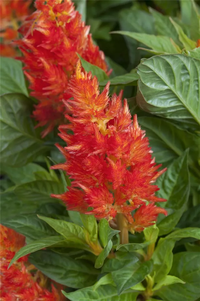 Silber-Brandschopf 'Fire Red' ist auch unter diesem Namen bekannt: Hahnenkamm, Celosie oder Federbusch.