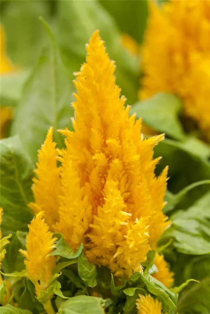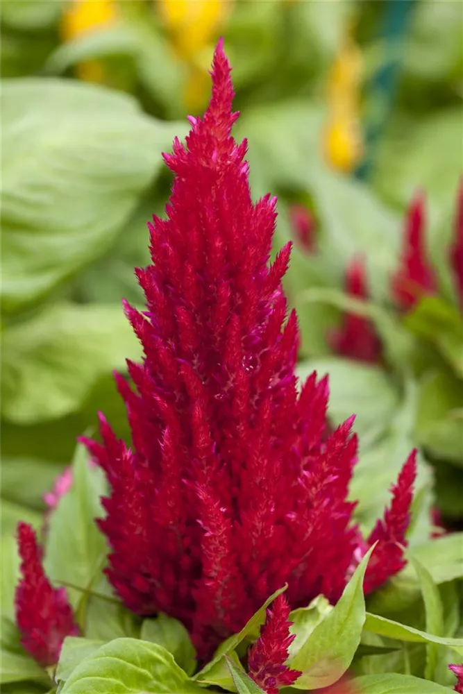 Die Federbusch-Celosie (Celosia argentea var. plumosa) ist eine beliebte Pflanze für den Balkon, die während der gesamten Saison unzählige gelbe, rote, orangefarbene Blüten bildet. Ein sonniger Standort und ein durchlässiges Substrat werden bevorzugt.