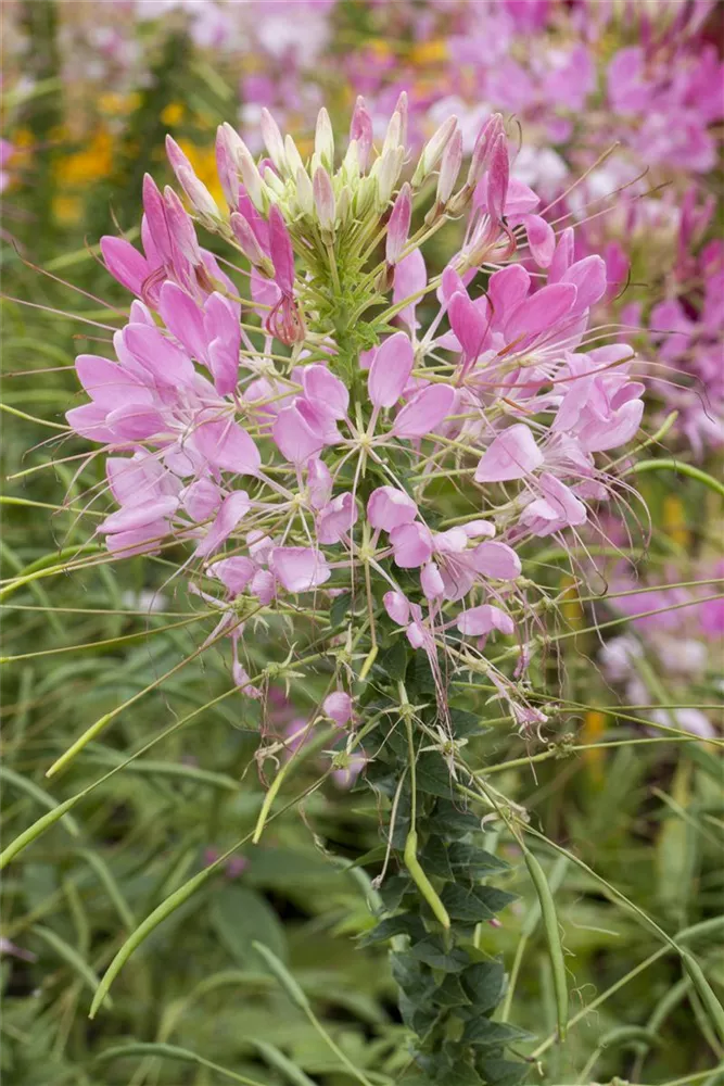 Cleome spinosa wächst buschig und erreicht gewöhnlich eine Höhe von 1 - 1,5 m und wird bis zu 30 - 50 cm breit.