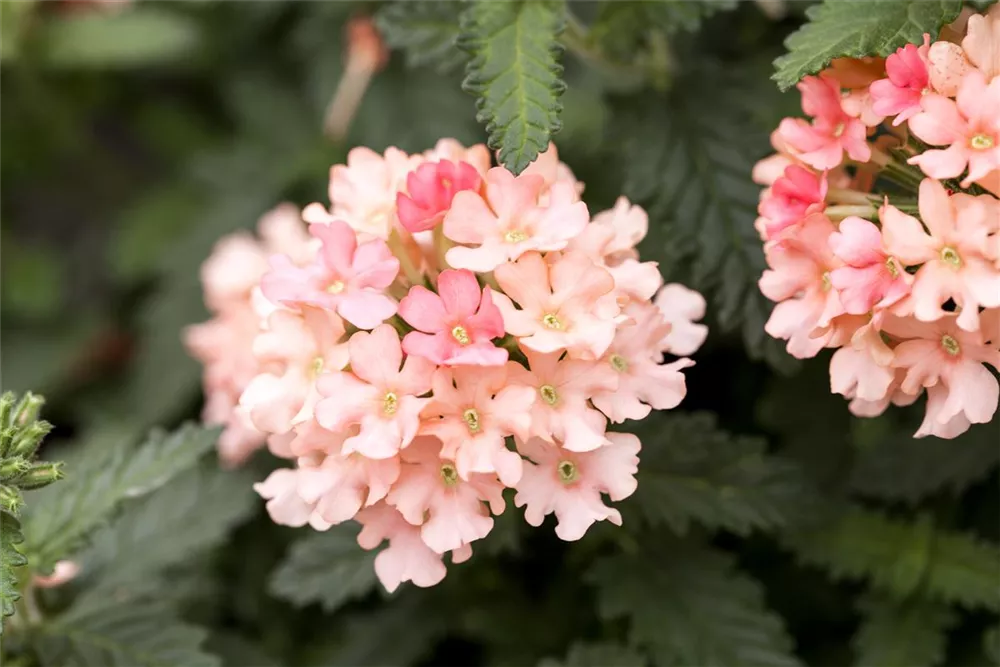 Die Hänge-Verbene Samira® 'Peach' (Verbena) ist eine beliebte Pflanze für den Balkon. Die unzähligen Blüten erscheinen, je nach Sorte, in verschiedenen Farben die ganze Saison hindurch. Ein sonniger Standort und ein durchlässiges Substrat werden bevorzugt.