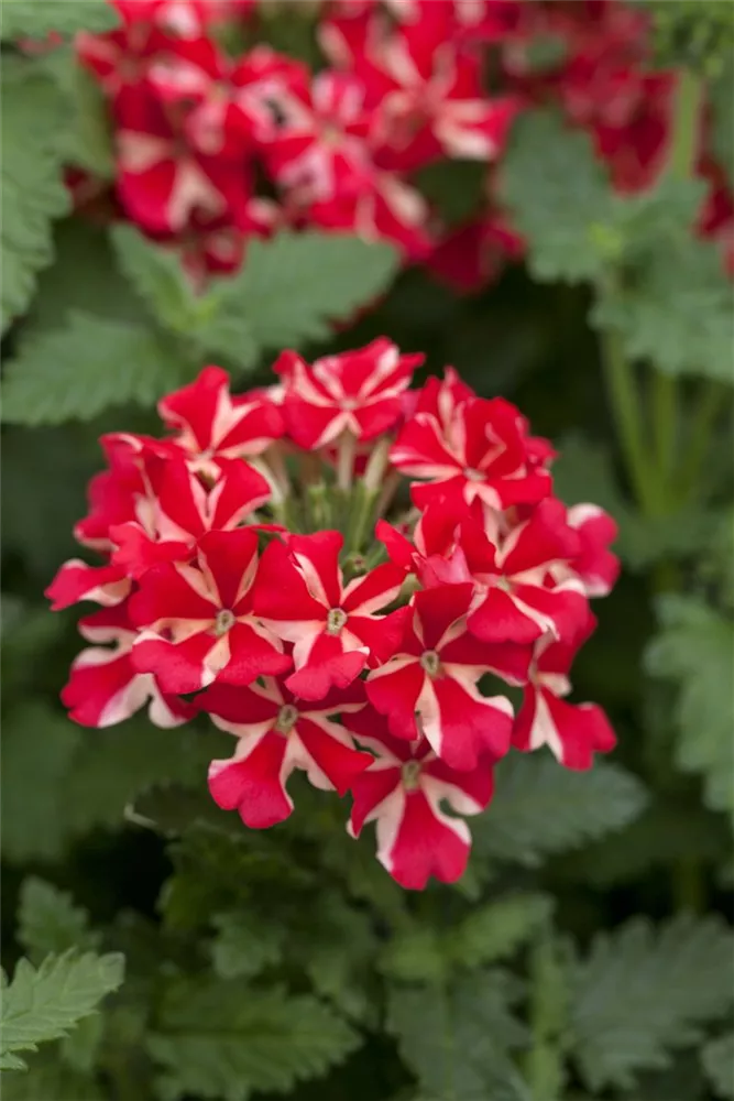 Verbena Samira® 'Red Star' bildet während der gesamten Saison zahlreiche radförmige, in Dolden angeordnete, rot-weiße Blüten.