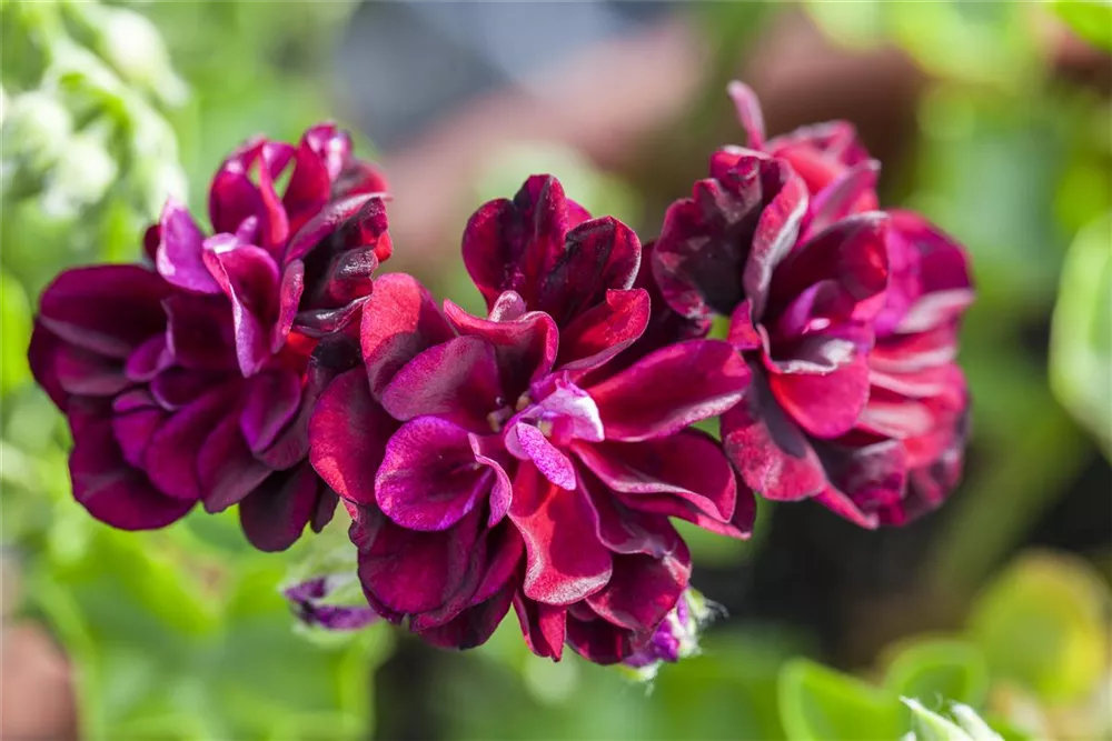 Pelargonium peltatum 'Tommy' bildet während der gesamten Saison zahlreiche gefüllte, dunkelrote Blüten.