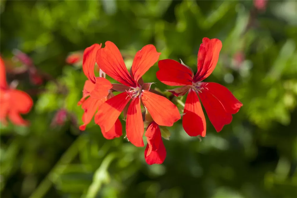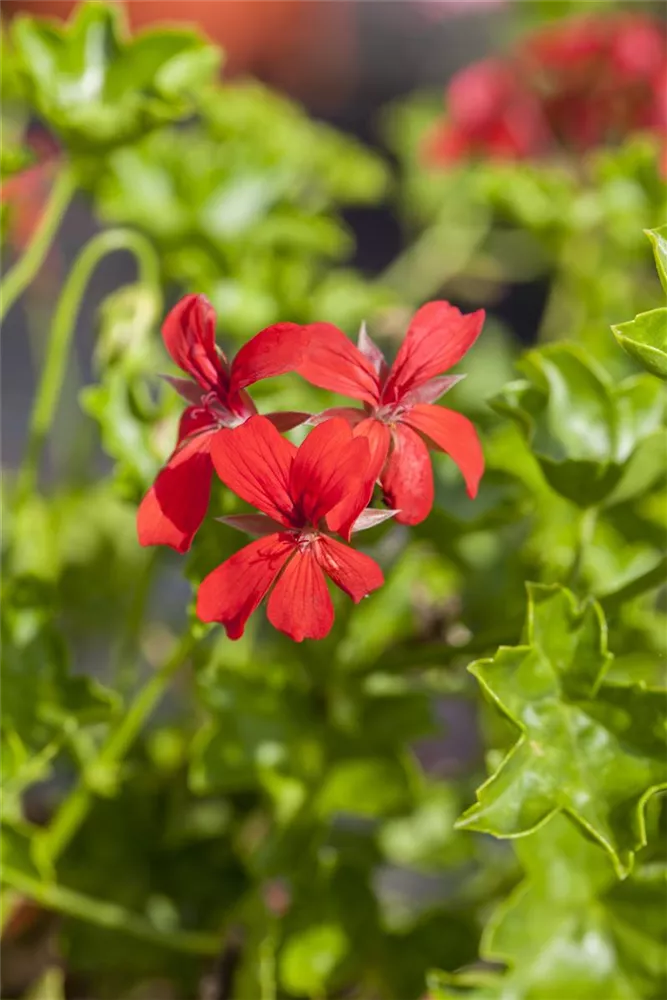Pelargonium peltatum 'Ville de Paris Rot' bildet während der gesamten Saison zahlreiche rote Blüten.