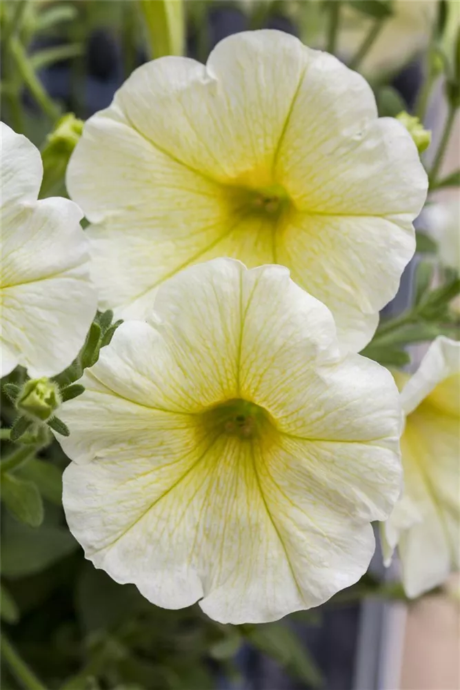 - Hängepetunie 'Yellow', Petunia mit Rosenblüte