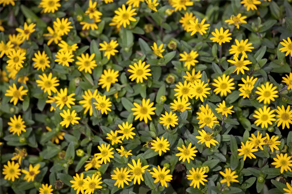 Sanvitalia procumbens 'Solaris® Yellow' bildet während der gesamten Saison zahlreiche radförmige, gelbe Blüten.