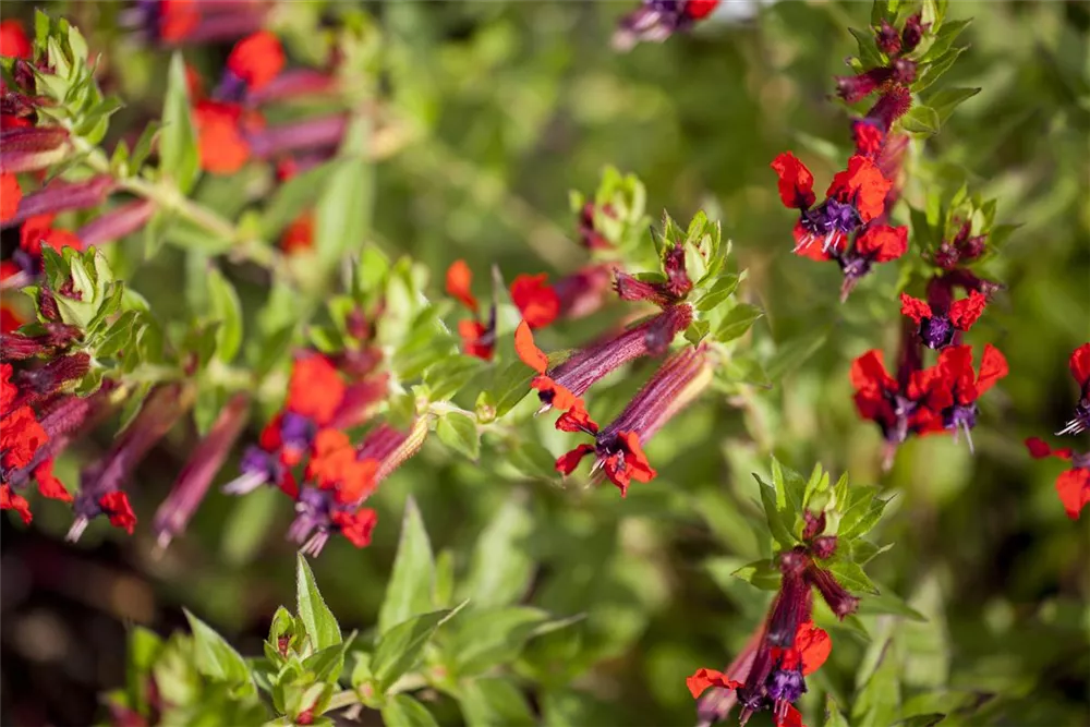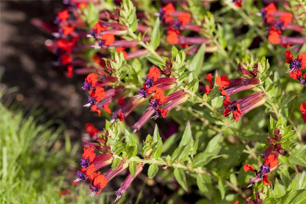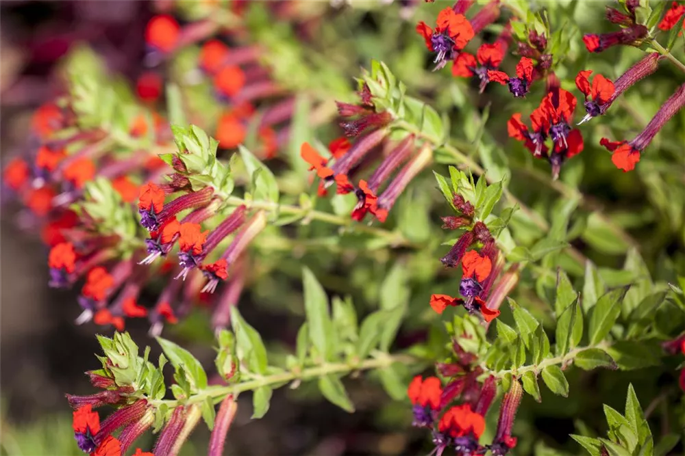 Die Mickymaus-Pflanze 'Tiny Mice'® (Cuphea llavea) ist eine beliebte Pflanze für den Balkon, die während der gesamten Saison unzählige zweifarbige Blüten bildet. Ein halbschattiger Standort und ein durchlässiges Substrat werden bevorzugt.