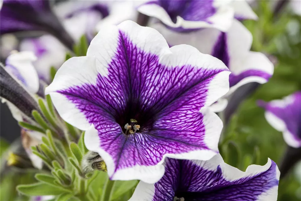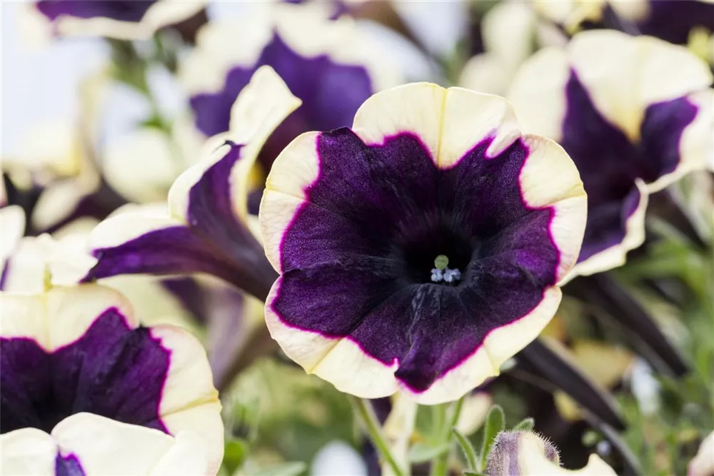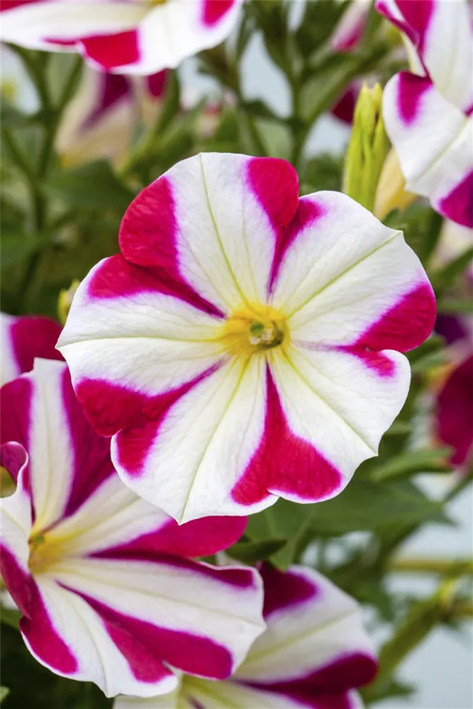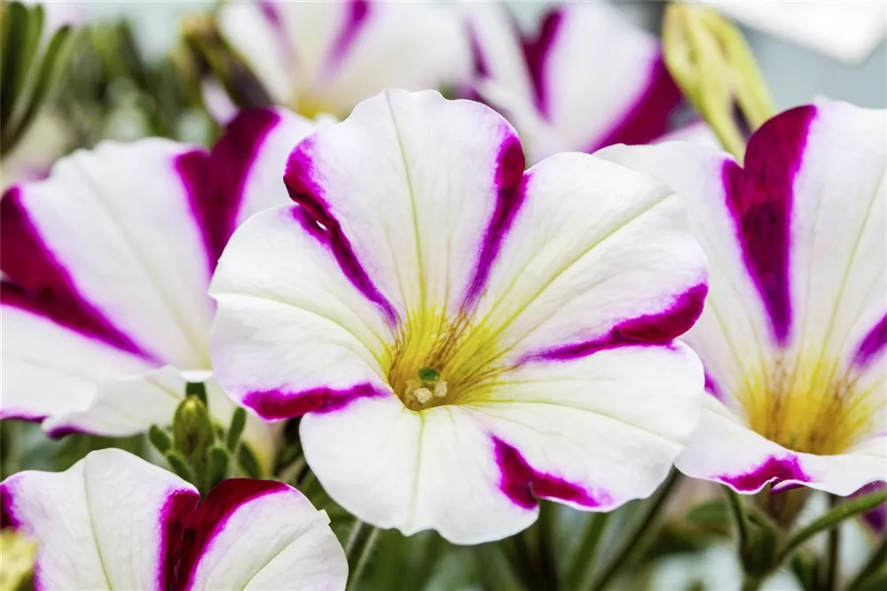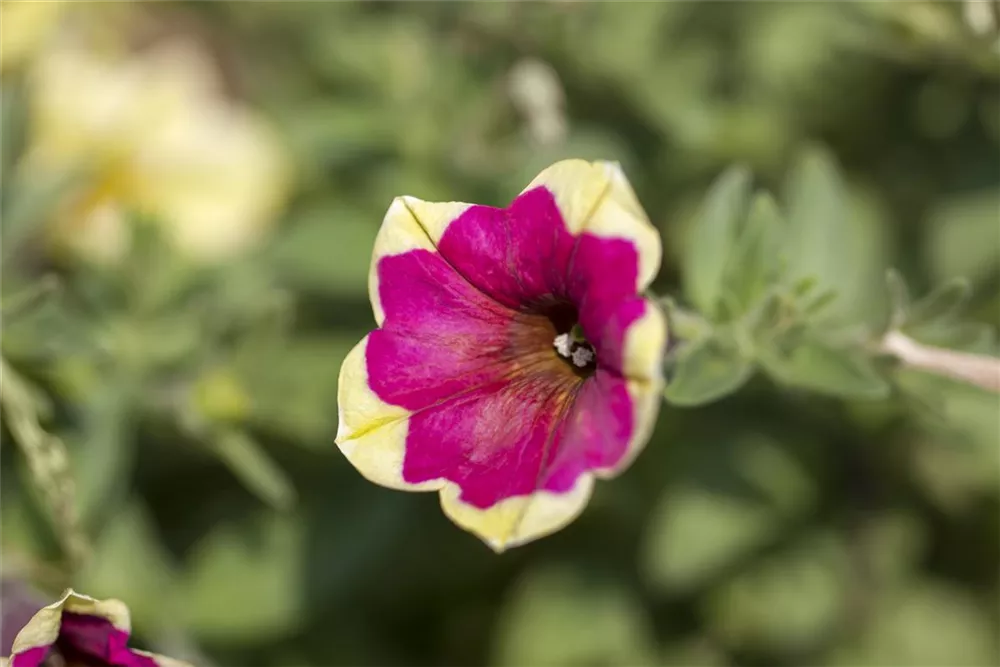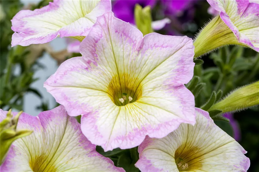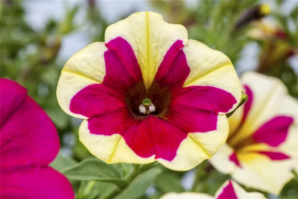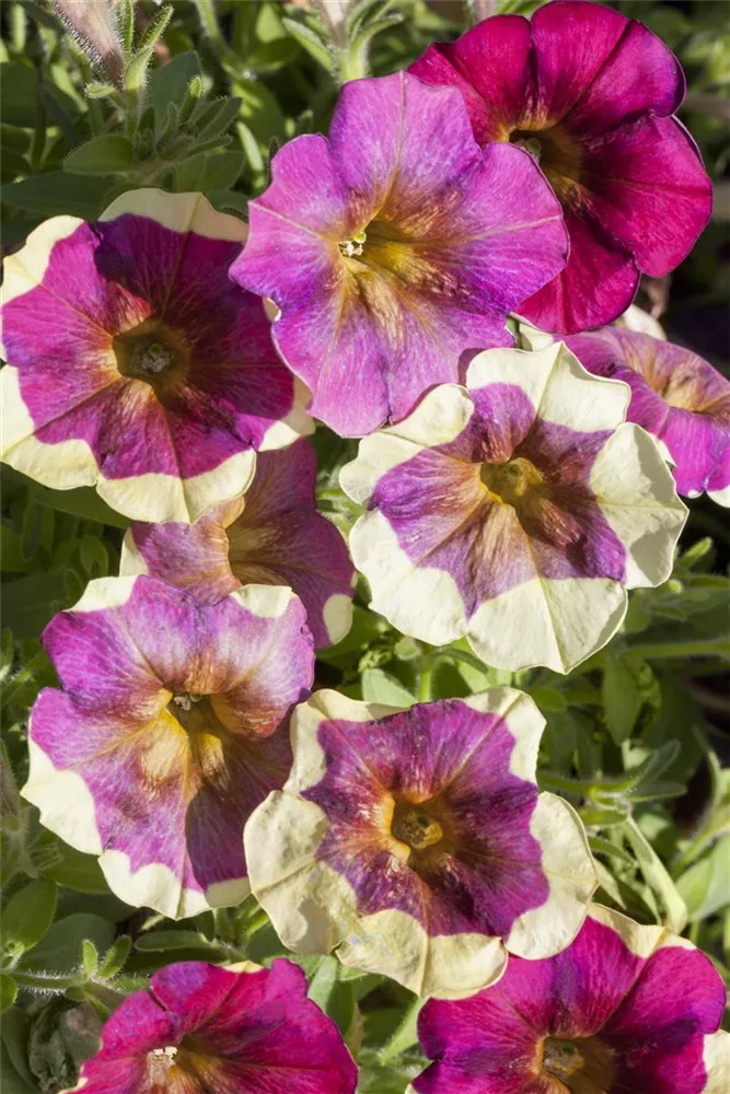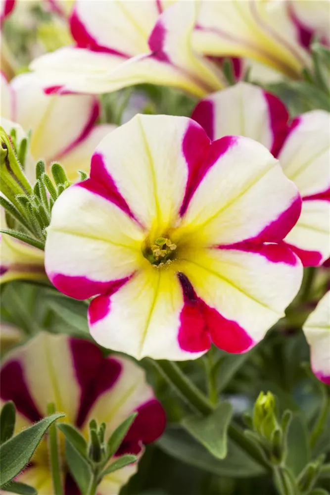 Petunia 'Chameletunia'® bildet während der gesamten Saison zahlreiche trichterförmige, bunte Blüten.