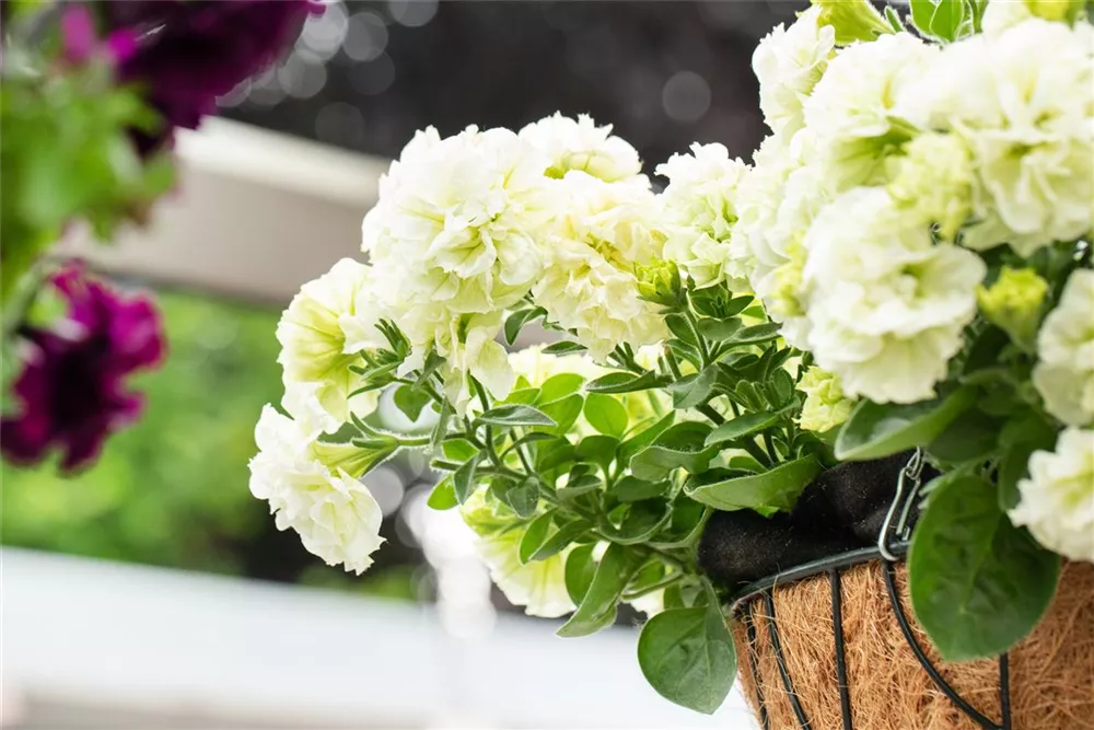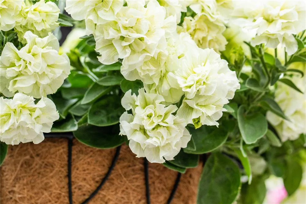 - Hängepetunie 'Origami White', Petunia mit Rosenblüte