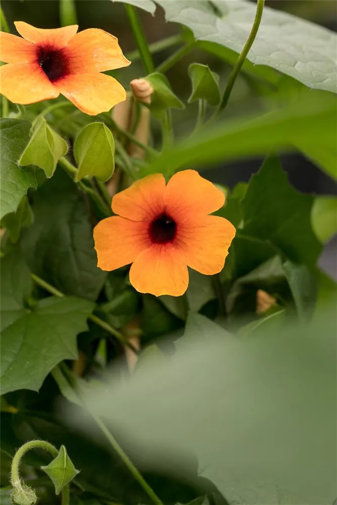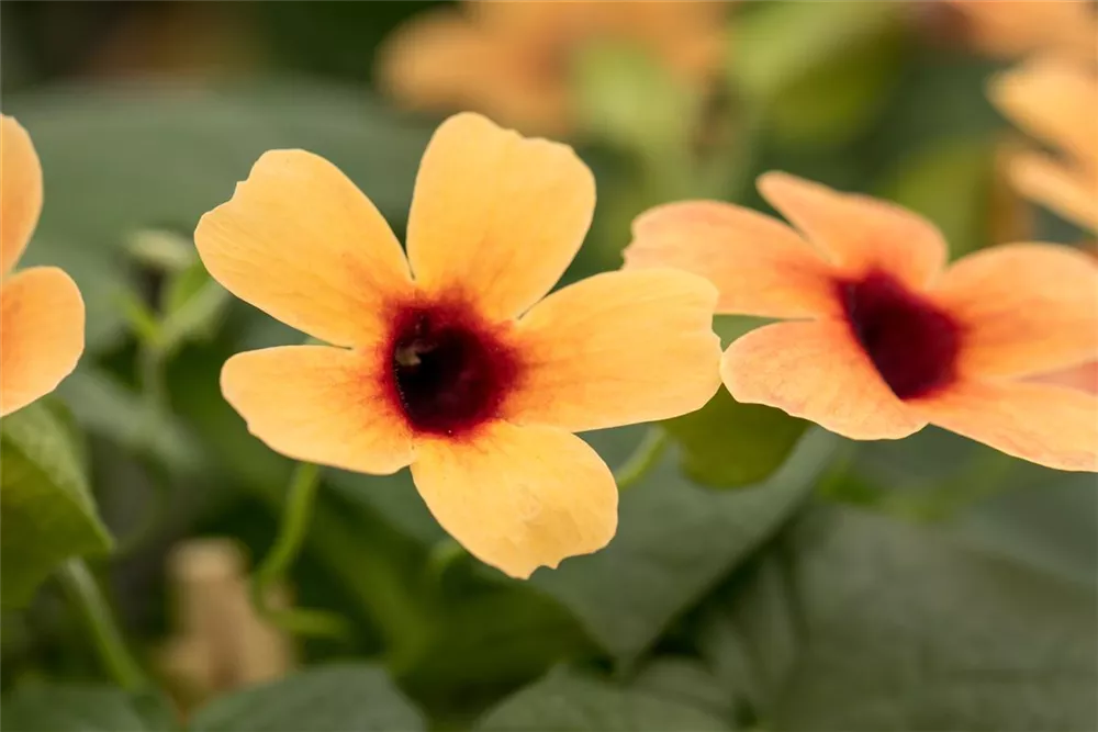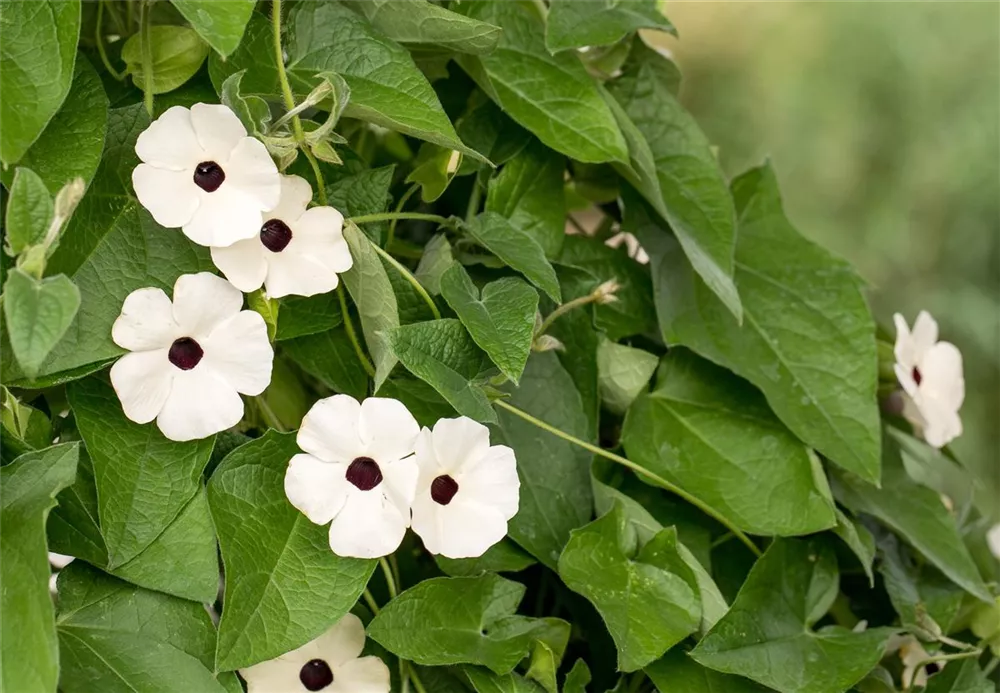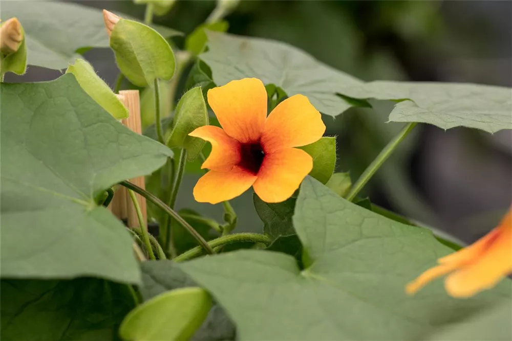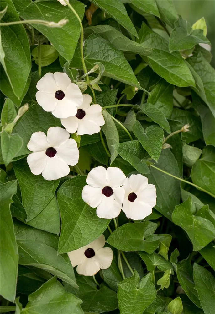 Die Schwarzäugige Susanne 'Sunny Susy'® (Thunbergia alata) ist eine beliebte Pflanze für den Balkon. Die unzähligen Blüten erscheinen, je nach Sorte, in verschiedenen Farben die ganze Saison hindurch. Ein sonniger bis halbschattiger Standort und ein durchlässiges Substrat werden bevorzugt.