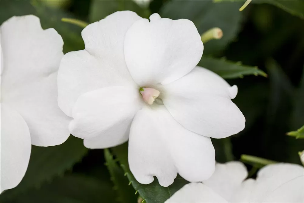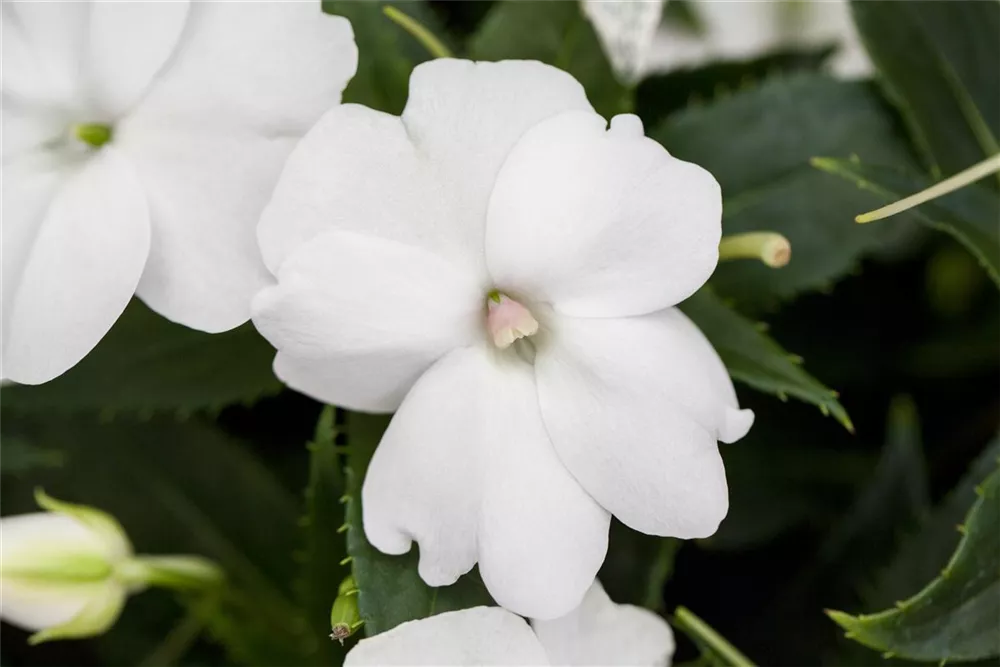 Das Sonnenlieschen 'SunPatiens® Compact White' (Impatiens neuguinea) ist eine beliebte Pflanze für den Balkon. Die unzähligen Blüten erscheinen, je nach Sorte, in verschiedenen Farben die ganze Saison hindurch. Ein sonniger bis schattiger Standort und ein durchlässiges Substrat werden bevorzugt.