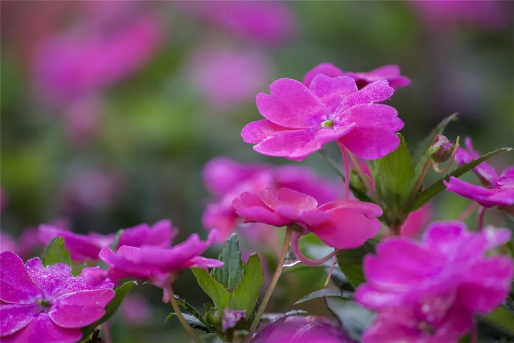 Impatiens neuguinea 'SunPatiens® Magenta' bildet während der gesamten Saison zahlreiche magentafarbene Blüten.