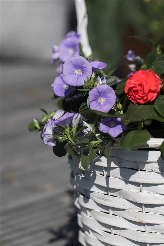 Die Zierwinde 'Manati® Deep Blue' (Convolvulus sabatius) ist eine beliebte Pflanze für den Balkon, die während der gesamten Saison unzählige blaue Blüten bildet. Ein sonniger bis halbschattiger Standort und ein durchlässiges Substrat werden bevorzugt.