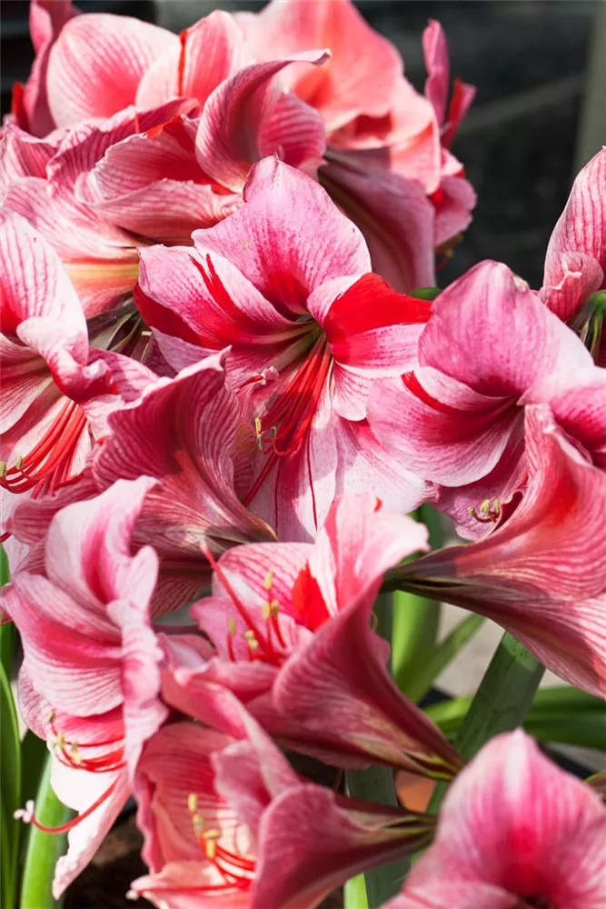 Welch eine Pracht, wenn der Ritterstern 'Gervase' ab Oktober seine herrlichen, rosa-roten, trichterförmigen Blüten hervorbringt! Über den dunkelgrünen, lanzettlichen Blättern kommen die Blüten besonders gut zur Geltung. Wird Hippeastrum 'Gervase' an einen sonnigen bis halbschattigen Standort mit durchlässigem und nährstoffreichem Boden gepflanzt, entwickelt er sich besonders gut. Er wächst schlank und erreicht Größen von 50 cm bis 60 cm bei einer Breite von 30 cm bis 40 cm. Auch als Zimmerpflanze eignet sich der Ritterstern 'Gervase' sehr gut. Hippeastrum 'Gervase' hat sich als besonders pflegeleicht erwiesen.