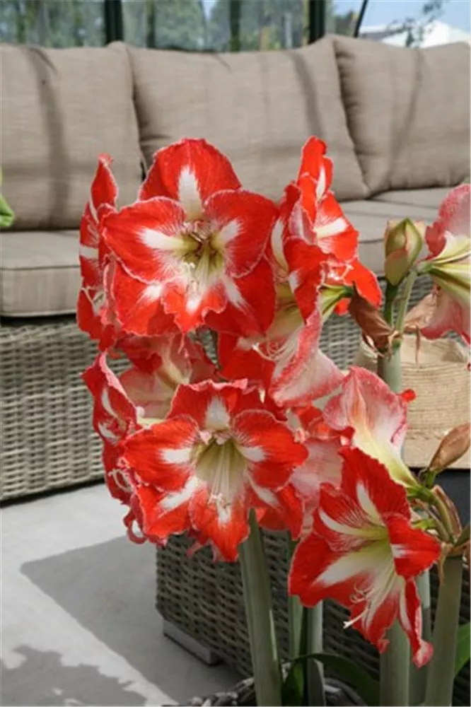 Zwischen Oktober und April lässt der Ritterstern 'Minerva' seine Blüten in Rot-weiß erstrahlen. Die trichterförmigen, 10 cm bis 20 cm großen Blüten sind in Dolden angeordnet.