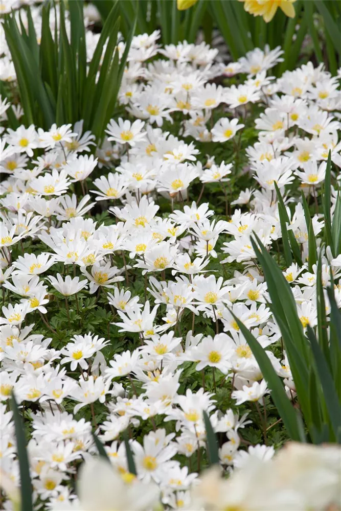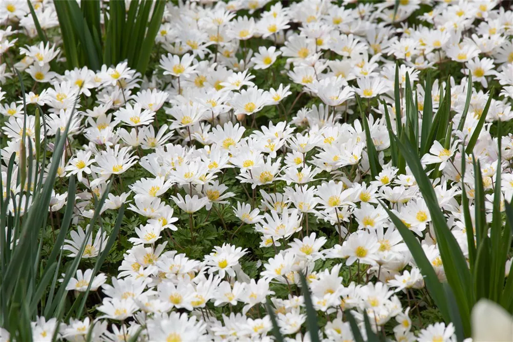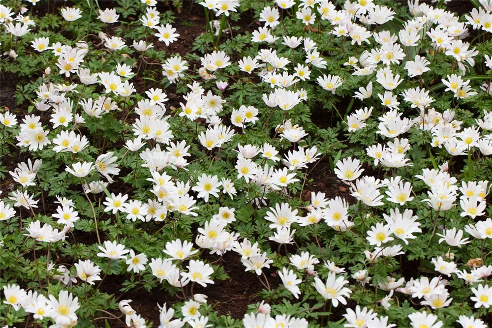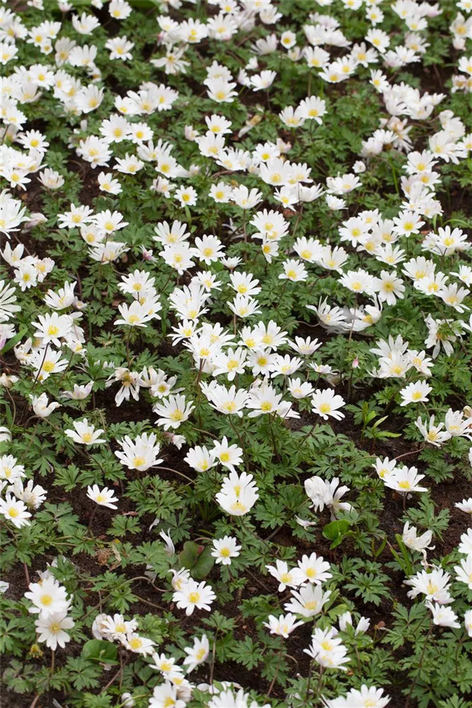 Welch eine Pracht, wenn das Garten-Strahlen-Windröschen 'White Splendour' ab März seine herrlichen, weißen, strahlenförmigen Blüten hervorbringt! Über den mittelgrünen, handförmigen Blättern mit ihrem gelappten Rand kommen die Blüten besonders gut zur Geltung. Wird Anemone blanda 'White Splendour' an einen sonnigen bis halbschattigen Standort mit durchlässigem, humosem und kalkfreiem Boden gepflanzt, entwickelt es sich besonders gut. Es wächst rhizombildend, horstbildend und erreicht Größen von 8 cm bis 10 cm bei einer Breite von 10 cm bis 15 cm.