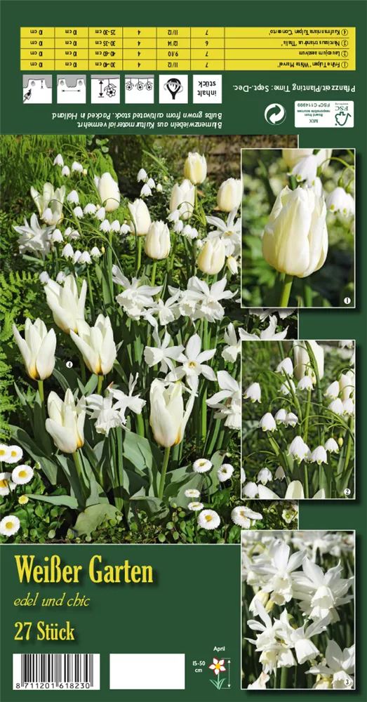 Welch eine Pracht, wenn das Blumenzwiebelsortiment 'Weißer Garten' ab April seine herrlichen, weißen Blüten hervorbringt! Über den dunkelgrünen Blättern kommen die Blüten besonders gut zur Geltung. Wird Zwiebelpflanzen 'Weißer Garten' an einen sonnigen bis schattigen Standort mit durchlässigem und lockerem Boden gepflanzt, entwickelt es sich besonders gut. Es wächst aufrecht und erreicht Größen von 15 cm bis 50 cm.