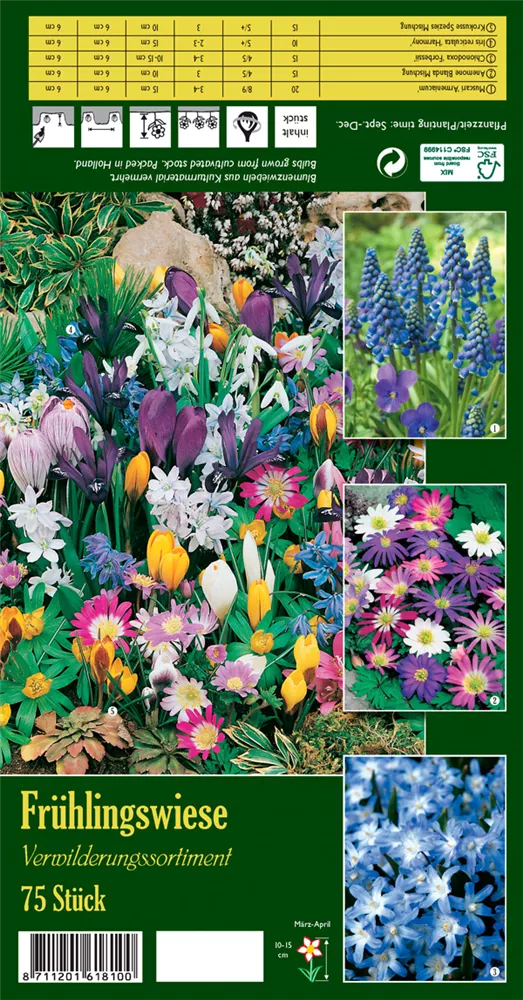 Welch eine Pracht, wenn die Frühlingswiese ab März ihre herrlichen, bunten Blüten hervorbringt! Wird Verwilderungssortiment an einen sonnigen bis schattigen Standort mit durchlässigem und lockerem Boden gepflanzt, entwickelt sie sich besonders gut. Sie wächst aufrecht und erreicht Größen von 10 cm bis 15 cm.