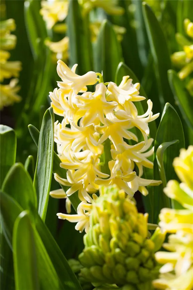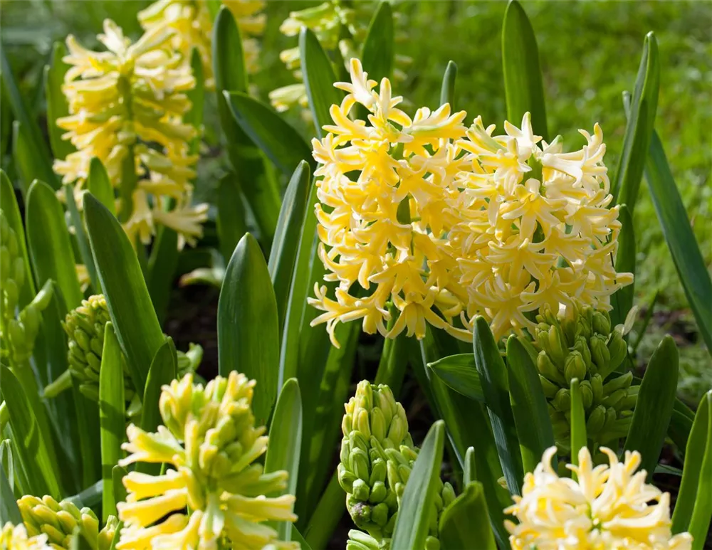 Zwischen April und Mai lässt die Hyazinthe 'City Of Haarlem' ihre Blüten in Hellgelb erstrahlen und ihren angenehmen Duft verbreiten. Die trichterförmigen Blüten sind in Trauben angeordnet.
