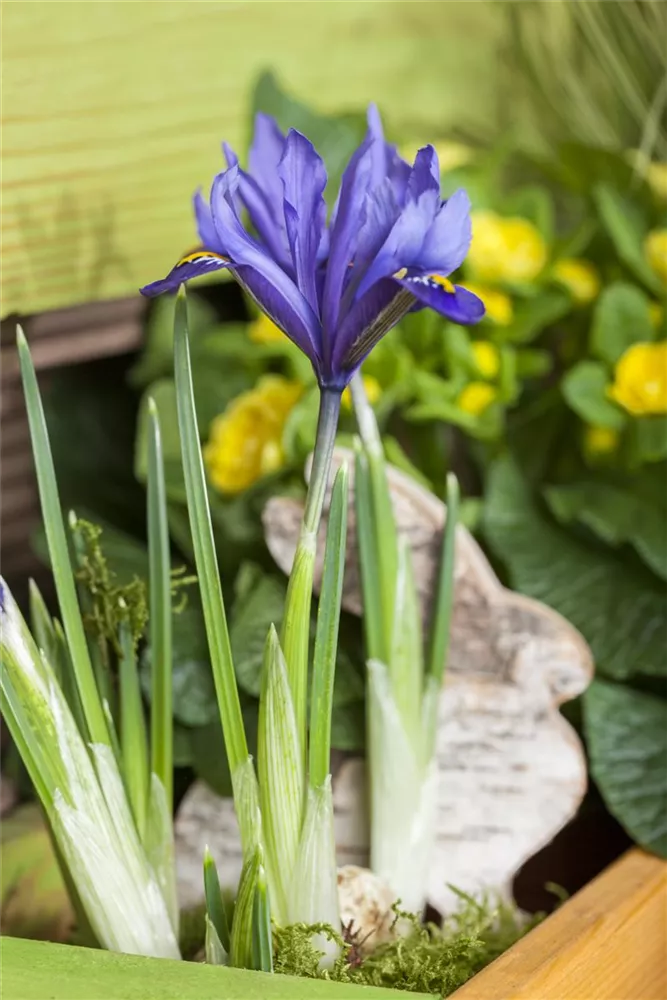 Welch eine Pracht, wenn die Zwiebel-Schwertlilie ab Februar ihre herrlichen, blauen Blüten hervorbringt! Das Besondere: sie verbreiten einen angenehmen Duft. Über den mittelgrünen, lanzettlichen Blättern kommen die Blüten besonders gut zur Geltung. Wird Iris reticulata an einen sonnigen Standort mit durchlässigem und lockerem Boden gepflanzt, entwickelt sie sich besonders gut. Sie wächst aufrecht, kompakt, rhizombildend und erreicht Größen von 10 cm bis 15 cm bei einer Breite von 6 cm bis 8 cm. Sehr dekorativ macht sich die Zwiebel-Schwertlilie auch in Kübeln oder Kästen.