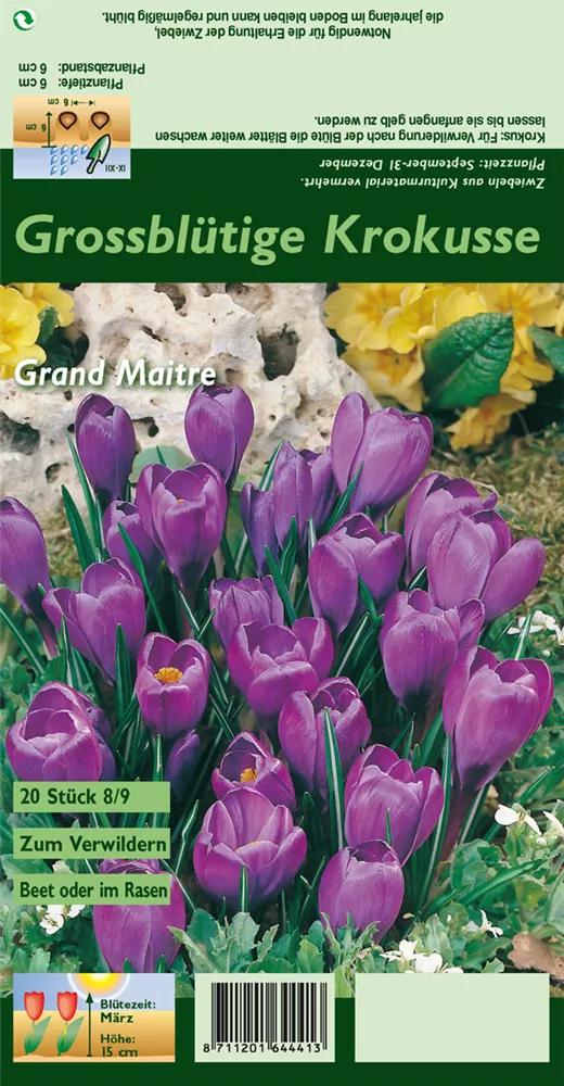 Welch eine Pracht, wenn der Frühlings-Krokus 'Grand Maitre' ab März seine herrlichen, blauvioletten, trichterförmigen Blüten hervorbringt! Das Besondere: sie verbreiten einen angenehmen Duft. Über den dunkelgrünen, linealen Blättern kommen die Blüten besonders gut zur Geltung. Wird Crocus vernus 'Grand Maitre' an einen sonnigen bis halbschattigen Standort mit durchlässigem, nährstoffreichem und sandigem Boden gepflanzt, entwickelt er sich besonders gut. Er wächst aufrecht und erreicht Größen von 10 cm bis 15 cm bei einer Breite von 3 cm bis 5 cm. Sehr dekorativ macht sich der Frühlings-Krokus 'Grand Maitre' auch in Kübeln oder Kästen.