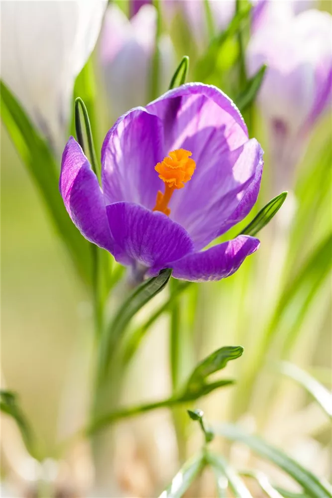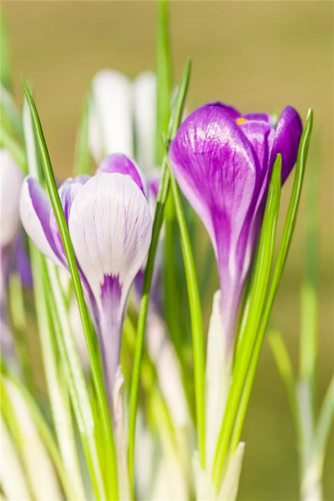 Welch eine Pracht, wenn der Frühlings-Krokus 'King of the Striped' ab Februar seine herrlichen, blau-weißen Blüten hervorbringt! Das Besondere: sie verbreiten einen angenehmen Duft. Über den dunkelgrünen, linealen Blättern kommen die Blüten besonders gut zur Geltung. Wird Crocus vernus 'King of the Striped' an einen sonnigen bis halbschattigen Standort mit durchlässigem, nährstoffreichem und sandigem Boden gepflanzt, entwickelt er sich besonders gut. Er wächst aufrecht und erreicht Größen von 10 cm bis 15 cm bei einer Breite von 3 cm bis 5 cm. Sehr dekorativ macht sich der Frühlings-Krokus 'King of the Striped' auch in Kübeln oder Kästen.