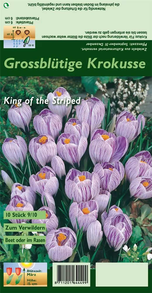 Die beste Pflanzzeit für Crocus vernus 'King of the Striped' ist September - Dezember.