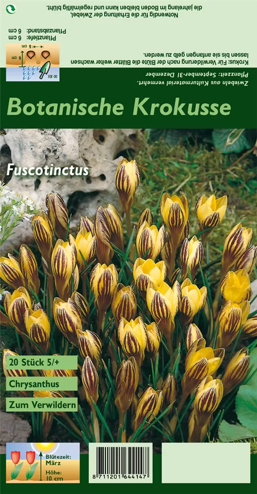 Welch eine Pracht, wenn der Garten-Krokus ab Februar seine herrlichen, goldgelben Blüten hervorbringt! Wird Crocus chrysanthus var. fuscotinctus an einen sonnigen Standort mit durchlässigem Boden gepflanzt, entwickelt er sich besonders gut. Er wächst aufrecht und erreicht Größen von 8 cm bis 10 cm bei einer Breite von 6 cm bis 8 cm. Sehr dekorativ macht sich der Garten-Krokus auch in Kübeln oder Kästen.