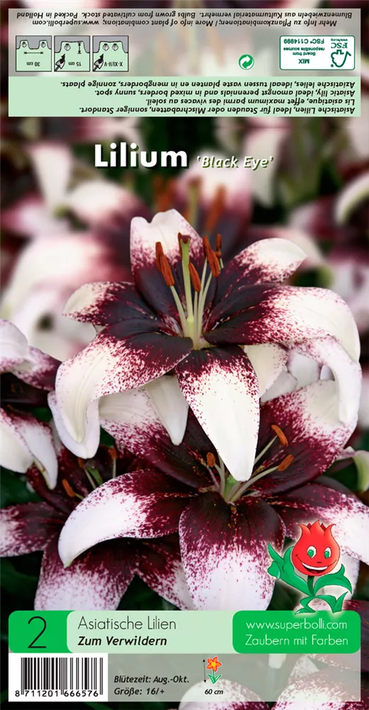 Welch eine Pracht, wenn die Asiatische Lilie 'Black Eye' ab August ihre herrlichen, purpurrot-weißen, trichterförmigen Blüten hervorbringt! Das Besondere: sie verbreiten einen angenehmen Duft. Über den dunkelgrünen, lanzettlichen Blättern kommen die Blüten besonders gut zur Geltung. Wird Lilium 'Black Eye' an einen sonnigen bis halbschattigen Standort mit durchlässigem und humosem Boden gepflanzt, entwickelt sie sich besonders gut. Sie wächst aufrecht und erreicht Größen von 40 cm bis 60 cm bei einer Breite von 10 cm bis 15 cm. Sehr dekorativ macht sich die Asiatische Lilie 'Black Eye' auch in Kübeln oder Kästen. Lilium 'Black Eye' hat sich als besonders pflegeleicht erwiesen.