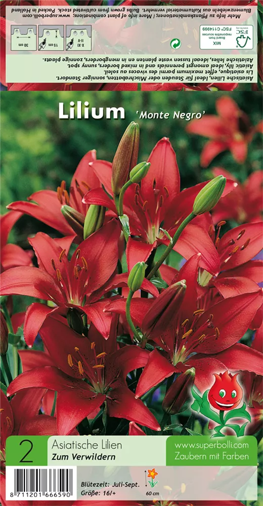 Welch eine Pracht, wenn die Asiatische Lilie 'Monte Negro' ab Juli ihre herrlichen, roten, trichterförmigen Blüten hervorbringt! Das Besondere: sie verbreiten einen angenehmen Duft. Über den dunkelgrünen, lanzettlichen Blättern kommen die Blüten besonders gut zur Geltung. Wird Lilium 'Monte Negro' an einen sonnigen bis halbschattigen Standort mit durchlässigem und humosem Boden gepflanzt, entwickelt sie sich besonders gut. Sie wächst aufrecht und erreicht Größen von 40 cm bis 60 cm bei einer Breite von 20 cm bis 30 cm. Sehr dekorativ macht sich die Asiatische Lilie 'Monte Negro' auch in Kübeln oder Kästen. Lilium 'Monte Negro' hat sich als besonders pflegeleicht erwiesen.