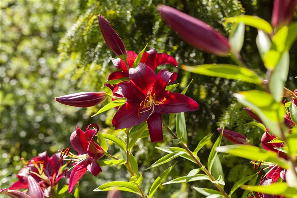 Zwischen Juni und Juli lässt die Türkenbund-Lilie 'Claude Shride' ihre Blüten in Dunkelrot erstrahlen und ihren angenehmen Duft verbreiten.