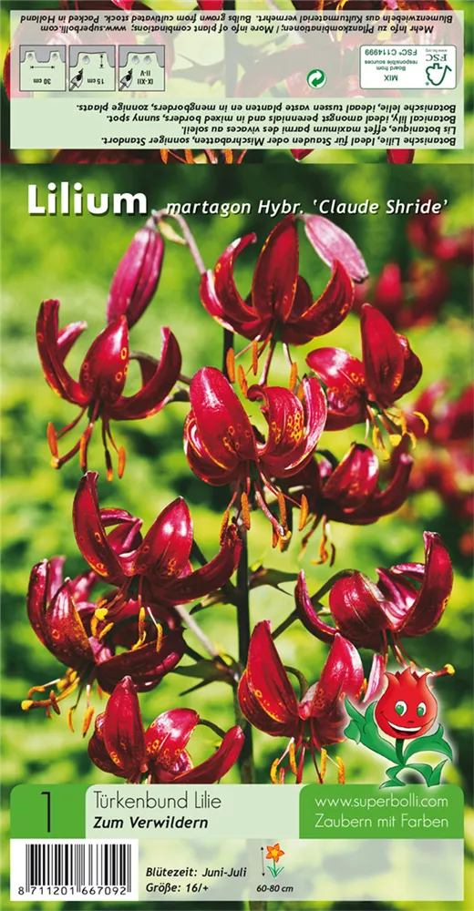 Welch eine Pracht, wenn die Türkenbund-Lilie 'Claude Shride' ab Juni ihre herrlichen, dunkelroten Blüten hervorbringt! Das Besondere: sie verbreiten einen angenehmen Duft. Über den mittelgrünen, lanzettlichen Blättern kommen die Blüten besonders gut zur Geltung. Wird Lilium martagon 'Claude Shride' an einen sonnigen bis halbschattigen Standort mit durchlässigem, kalkhaltigem und nährstoffreichem Boden gepflanzt, entwickelt sie sich besonders gut. Sie wächst aufrecht und erreicht Größen von 60 cm bis 80 cm bei einer Breite von 20 cm bis 30 cm. Sehr dekorativ macht sich die Türkenbund-Lilie 'Claude Shride' auch in Kübeln oder Kästen. Lilium martagon 'Claude Shride' hat sich als besonders pflegeleicht erwiesen.