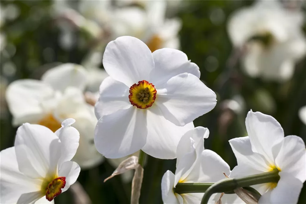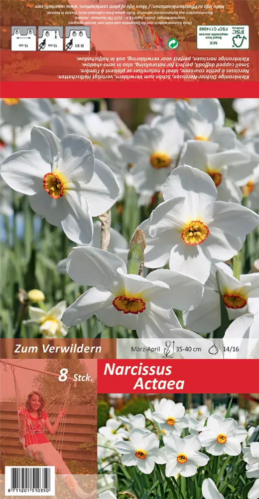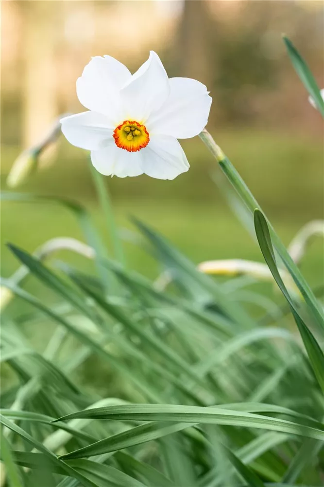 Welch eine Pracht, wenn die Garten-dichte-Narzisse 'Actaea' ab März ihre herrlichen, weißen, radförmigen Blüten hervorbringt! Das Besondere: sie verbreiten einen angenehmen Duft. Über den dunkelgrünen, linealen Blättern kommen die Blüten besonders gut zur Geltung. Wird Narcissus poeticus 'Actaea' an einen sonnigen bis halbschattigen Standort mit durchlässigem, lockerem und nährstoffreichem Boden gepflanzt, entwickelt sie sich besonders gut. Sie wächst aufrecht und erreicht Größen von 30 cm bis 40 cm bei einer Breite von 10 cm bis 15 cm. Sehr dekorativ macht sich die Garten-dichte-Narzisse 'Actaea' auch in Kübeln oder Kästen.