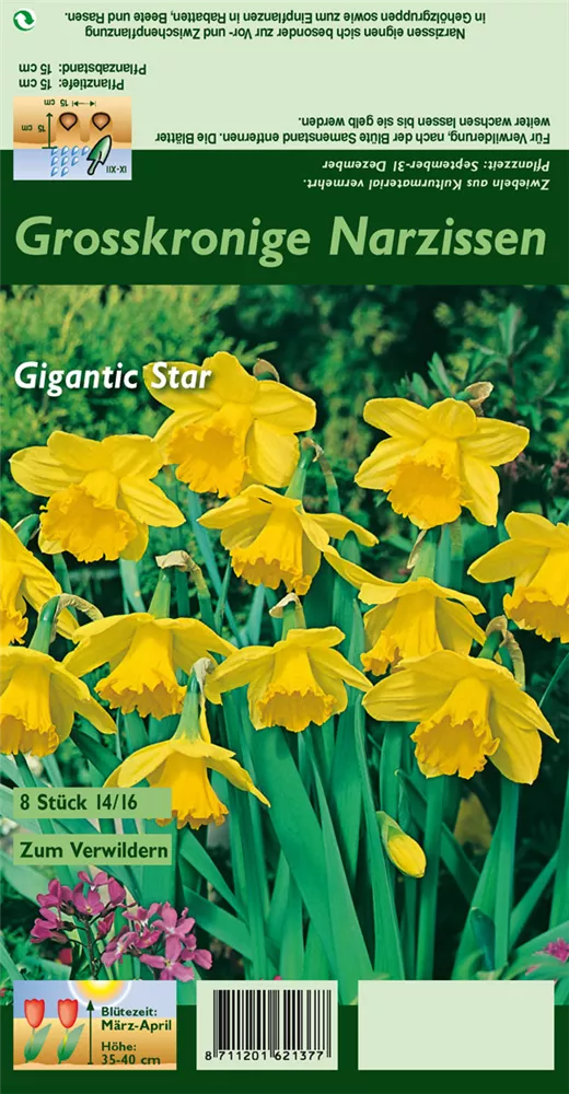 Welch eine Pracht, wenn die Großkronige Narzisse 'Gigantic Star' ab März ihre herrlichen, gelben, radförmigen oder röhrenförmigen Blüten hervorbringt! Das Besondere: sie verbreiten einen angenehmen Duft. Über den dunkelgrünen, linealen Blättern kommen die Blüten besonders gut zur Geltung. Wird Narcissus 'Gigantic Star' an einen sonnigen bis halbschattigen Standort mit durchlässigem, lockerem und nährstoffreichem Boden gepflanzt, entwickelt sie sich besonders gut. Sie wächst aufrecht und erreicht Größen von 35 cm bis 40 cm bei einer Breite von 10 cm bis 15 cm. Sehr dekorativ macht sich die Großkronige Narzisse 'Gigantic Star' auch in Kübeln oder Kästen.