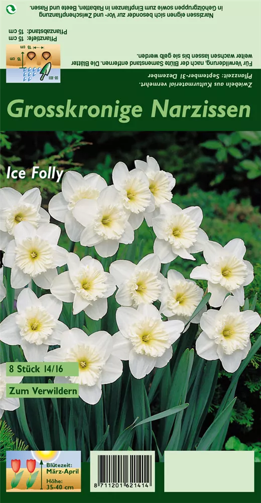 Welch eine Pracht, wenn die Großkronige Narzisse 'Ice Follies' ab März ihre herrlichen, weiß-gelben, radförmigen oder röhrenförmigen Blüten hervorbringt! Das Besondere: sie verbreiten einen angenehmen Duft. Über den dunkelgrünen, linealen Blättern kommen die Blüten besonders gut zur Geltung. Wird Narcissus 'Ice Follies' an einen sonnigen bis halbschattigen Standort mit durchlässigem, lockerem und nährstoffreichem Boden gepflanzt, entwickelt sie sich besonders gut. Sie wächst aufrecht und erreicht Größen von 35 cm bis 40 cm bei einer Breite von 10 cm bis 15 cm. Sehr dekorativ macht sich die Großkronige Narzisse 'Ice Follies' auch in Kübeln oder Kästen.