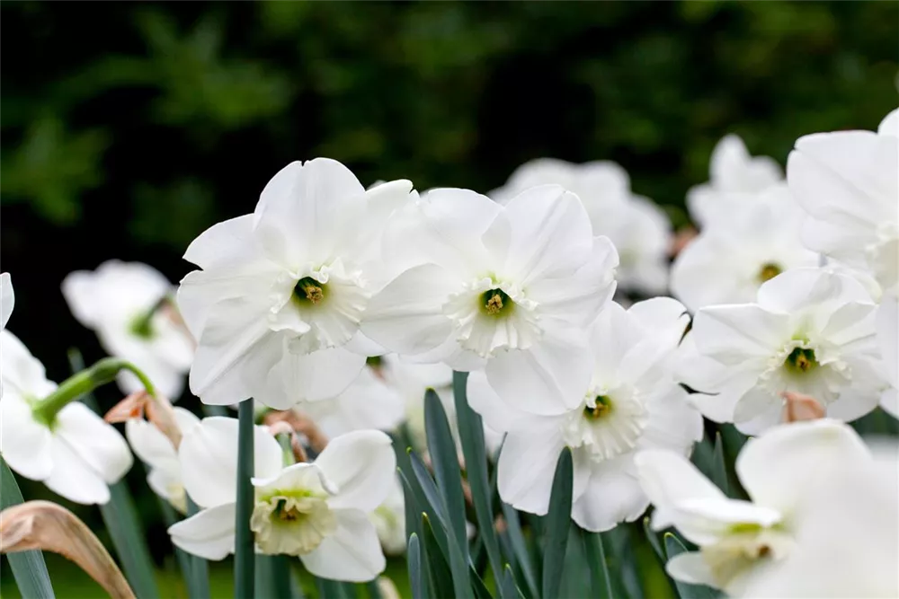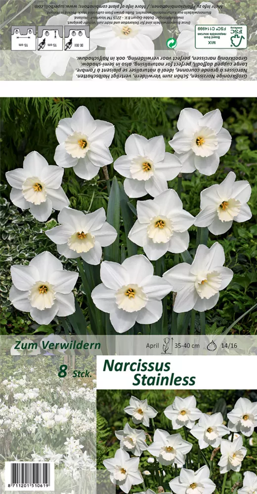 Welch eine Pracht, wenn die Großkronige Narzisse 'Stainless' ab April ihre herrlichen, weißen, radförmigen oder röhrenförmigen Blüten hervorbringt! Das Besondere: sie verbreiten einen angenehmen Duft. Über den dunkelgrünen, linealen Blättern kommen die Blüten besonders gut zur Geltung. Wird Narcissus 'Stainless' an einen sonnigen bis halbschattigen Standort mit durchlässigem, lockerem und nährstoffreichem Boden gepflanzt, entwickelt sie sich besonders gut. Sie wächst aufrecht und erreicht Größen von 35 cm bis 40 cm bei einer Breite von 10 cm bis 15 cm. Sehr dekorativ macht sich die Großkronige Narzisse 'Stainless' auch in Kübeln oder Kästen.