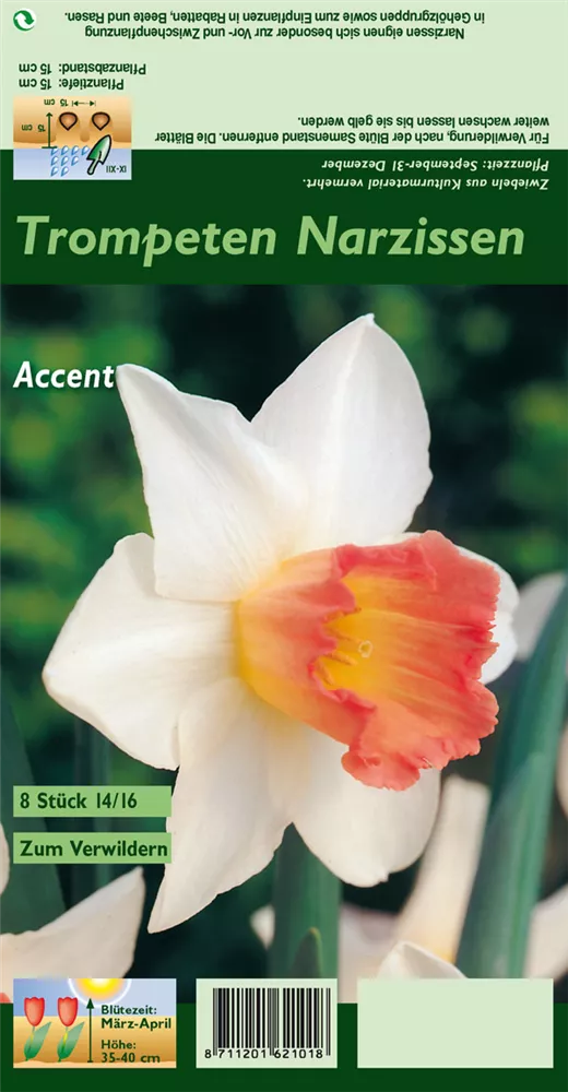 Welch eine Pracht, wenn die Narzisse 'Accent' ab März ihre herrlichen, weiß-orangefarbenen, radförmigen oder röhrenförmigen Blüten hervorbringt! Das Besondere: sie verbreiten einen angenehmen Duft. Über den dunkelgrünen, linealen Blättern kommen die Blüten besonders gut zur Geltung. Wird Narcissus 'Accent' an einen sonnigen bis halbschattigen Standort mit durchlässigem, lockerem und nährstoffreichem Boden gepflanzt, entwickelt sie sich besonders gut. Sie wächst aufrecht und erreicht Größen von 35 cm bis 40 cm bei einer Breite von 10 cm bis 15 cm. Sehr dekorativ macht sich die Narzisse 'Accent' auch in Kübeln oder Kästen.