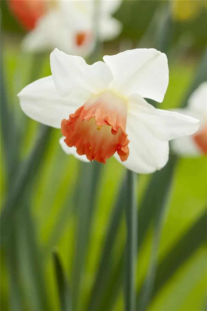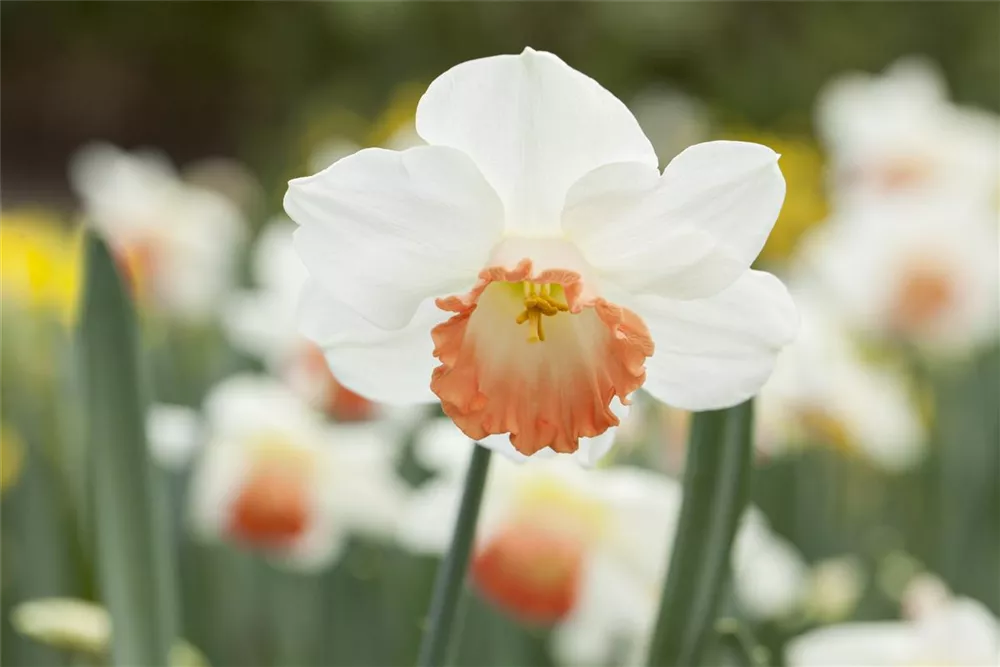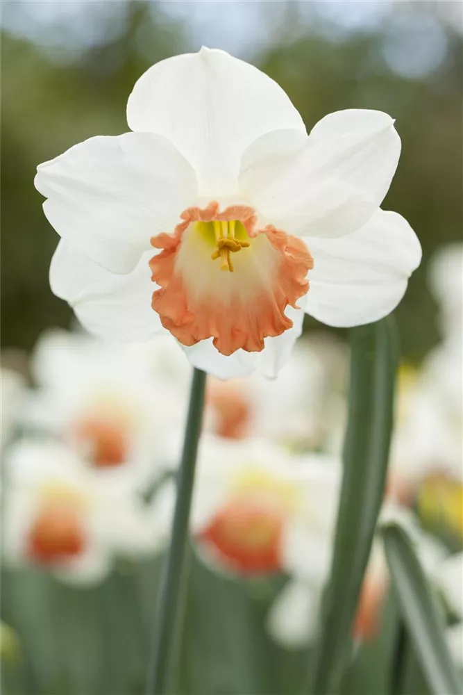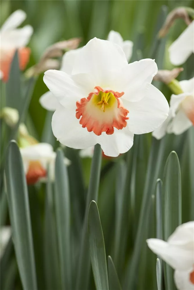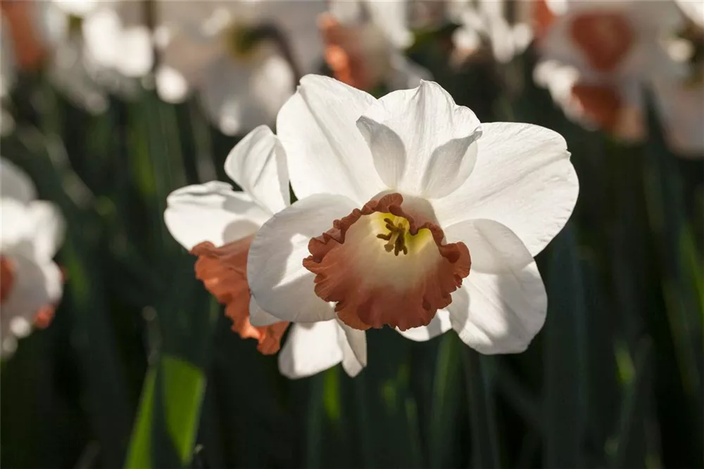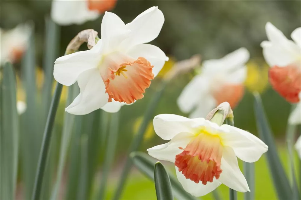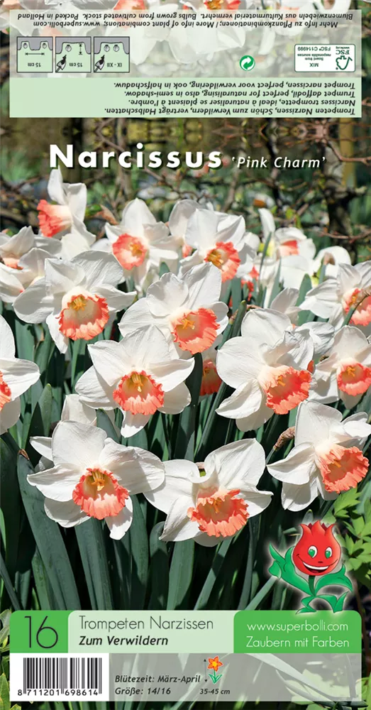 Welch eine Pracht, wenn die Narzisse 'Pink Charm' ab März ihre herrlichen, weiß-rosafarbenen, radförmigen oder röhrenförmigen Blüten hervorbringt! Das Besondere: sie verbreiten einen angenehmen Duft. Über den dunkelgrünen, linealen Blättern kommen die Blüten besonders gut zur Geltung. Wird Narcissus 'Pink Charm' an einen sonnigen bis halbschattigen Standort mit durchlässigem, lockerem und nährstoffreichem Boden gepflanzt, entwickelt sie sich besonders gut. Sie wächst aufrecht und erreicht Größen von 35 cm bis 45 cm bei einer Breite von 10 cm bis 15 cm. Sehr dekorativ macht sich die Narzisse 'Pink Charm' auch in Kübeln oder Kästen.