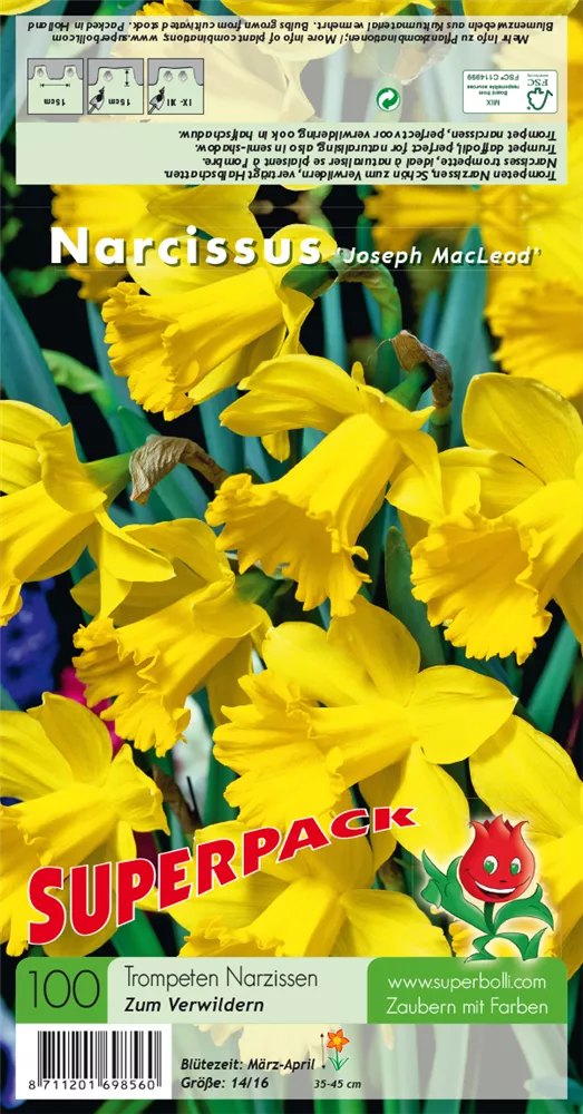 Welch eine Pracht, wenn die Trompeten-Narzisse 'Joseph MacLeod' ab März ihre herrlichen, gelben, radförmigen oder röhrenförmigen Blüten hervorbringt! Das Besondere: sie verbreiten einen angenehmen Duft. Über den dunkelgrünen, linealen Blättern kommen die Blüten besonders gut zur Geltung. Wird Narcissus 'Joseph MacLeod' an einen sonnigen Standort mit durchlässigem, lockerem und nährstoffreichem Boden gepflanzt, entwickelt sie sich besonders gut. Sie wächst aufrecht und erreicht Größen von 35 cm bis 45 cm bei einer Breite von 10 cm bis 15 cm. Sehr dekorativ macht sich die Trompeten-Narzisse 'Joseph MacLeod' auch in Kübeln oder Kästen.