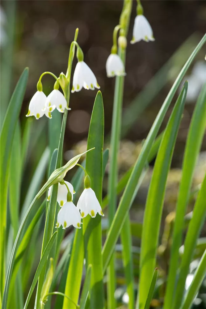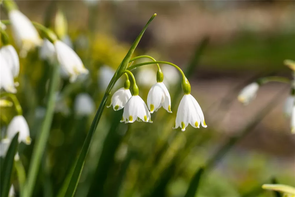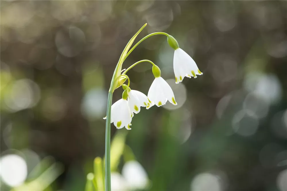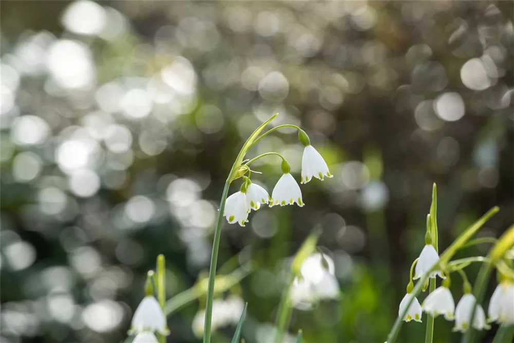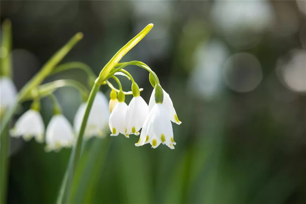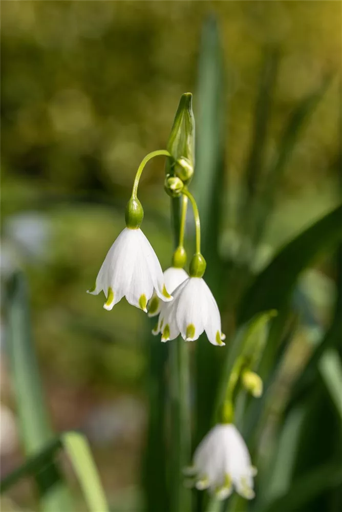 Zwischen April und Juni lässt die Sommer-Knotenblume ihre Blüten in Weiß erstrahlen und ihren angenehmen Duft verbreiten. Die Blüten sind glockenförmig.