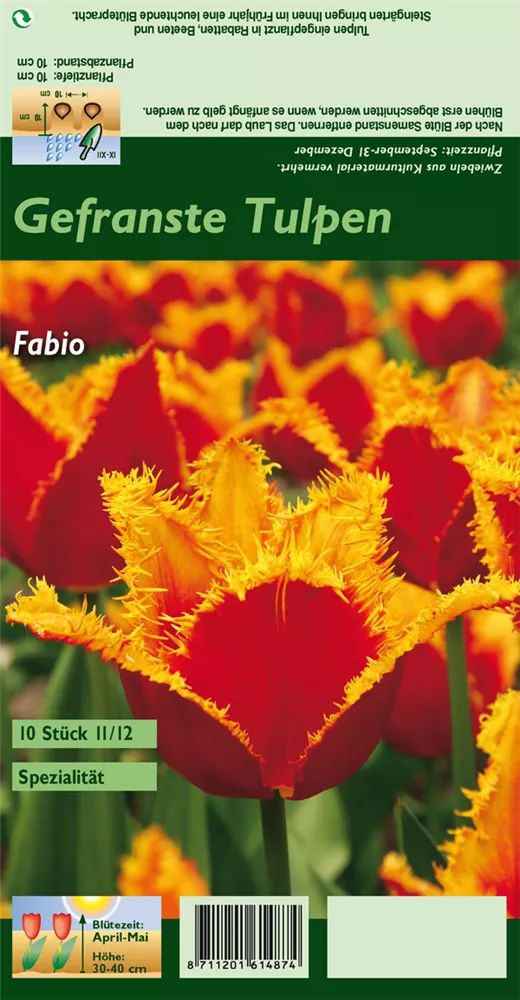 Welch eine Pracht, wenn die Gefranste Tulpe 'Fabio' ab April ihre herrlichen, rot-gelben, gefransten Blüten hervorbringt! Das Besondere: sie verbreiten einen angenehmen Duft. Über den dunkelgrünen, linealen Blättern kommen die Blüten besonders gut zur Geltung. Wird Tulipa 'Fabio' an einen sonnigen bis halbschattigen Standort mit durchlässigem, lockerem und nährstoffreichem Boden gepflanzt, entwickelt sie sich besonders gut. Sie wächst aufrecht, schlank und erreicht Größen von 30 cm bis 40 cm bei einer Breite von 10 cm bis 12 cm. Sehr dekorativ macht sich die Gefranste Tulpe 'Fabio' auch in Kübeln oder Kästen.