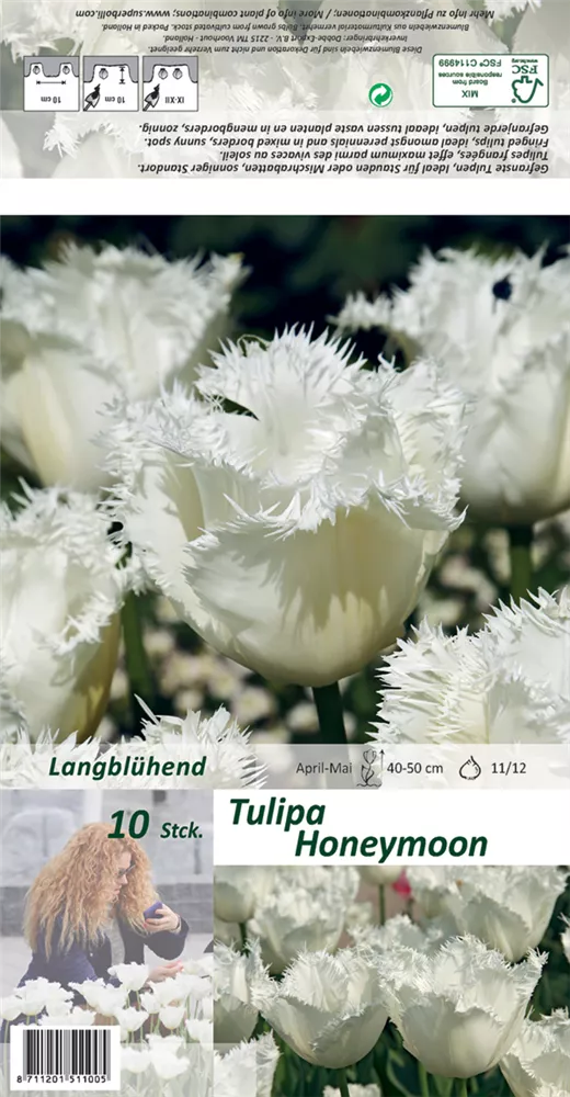Welch eine Pracht, wenn die Gefranste Tulpe 'Honeymoon' ab April ihre herrlichen, weißen, gefransten Blüten hervorbringt! Das Besondere: sie verbreiten einen angenehmen Duft. Über den dunkelgrünen, linealen Blättern kommen die Blüten besonders gut zur Geltung. Wird Tulipa 'Honeymoon' an einen sonnigen bis halbschattigen Standort mit durchlässigem, lockerem und nährstoffreichem Boden gepflanzt, entwickelt sie sich besonders gut. Sie wächst schlank, aufrecht und erreicht Größen von 40 cm bis 50 cm bei einer Breite von 10 cm bis 15 cm. Sehr dekorativ macht sich die Gefranste Tulpe 'Honeymoon' auch in Kübeln oder Kästen.