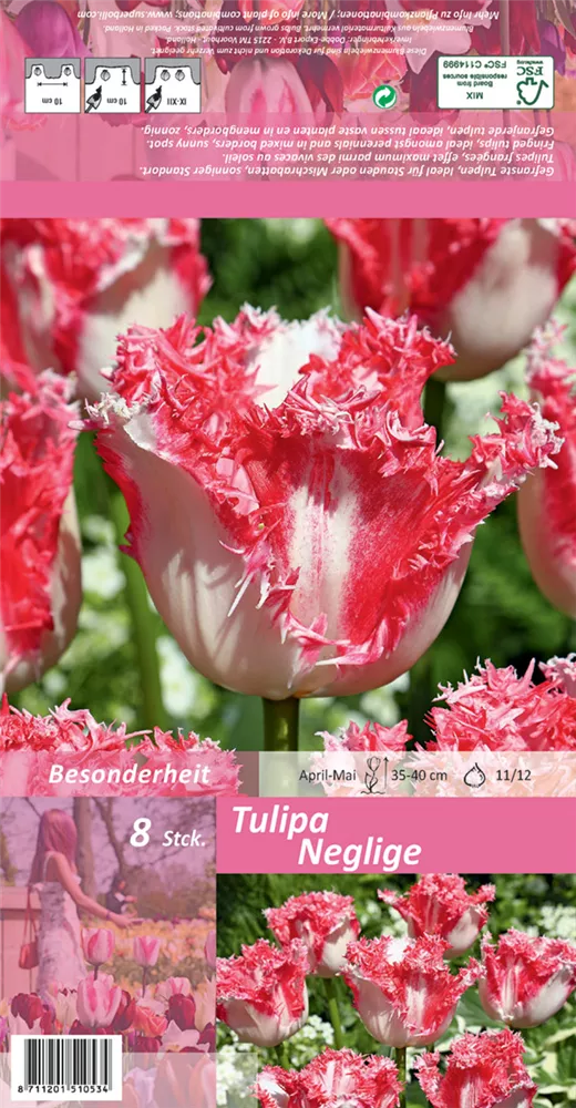 Welch eine Pracht, wenn die Gefranste Tulpe 'Neglige' ab April ihre herrlichen, weiß-rosafarbenen, gefransten Blüten hervorbringt! Das Besondere: sie verbreiten einen angenehmen Duft. Über den dunkelgrünen, linealen Blättern kommen die Blüten besonders gut zur Geltung. Wird Tulipa 'Neglige' an einen sonnigen bis halbschattigen Standort mit durchlässigem, lockerem und nährstoffreichem Boden gepflanzt, entwickelt sie sich besonders gut. Sie wächst schlank, aufrecht und erreicht Größen von 35 cm bis 40 cm bei einer Breite von 10 cm bis 12 cm. Sehr dekorativ macht sich die Gefranste Tulpe 'Neglige' auch in Kübeln oder Kästen.