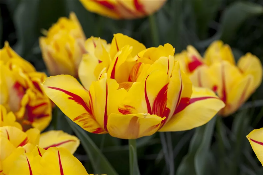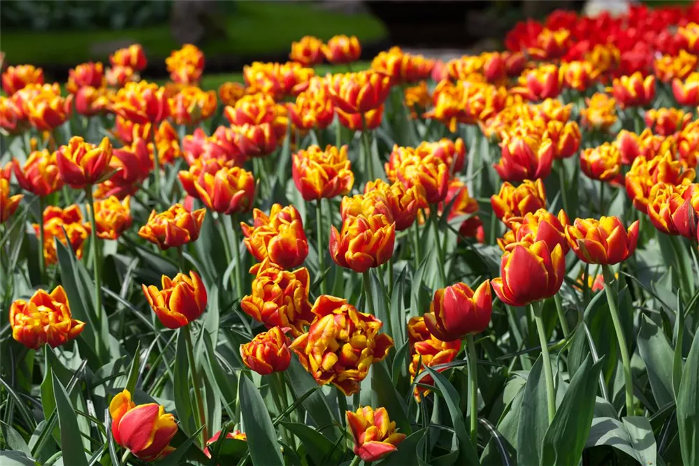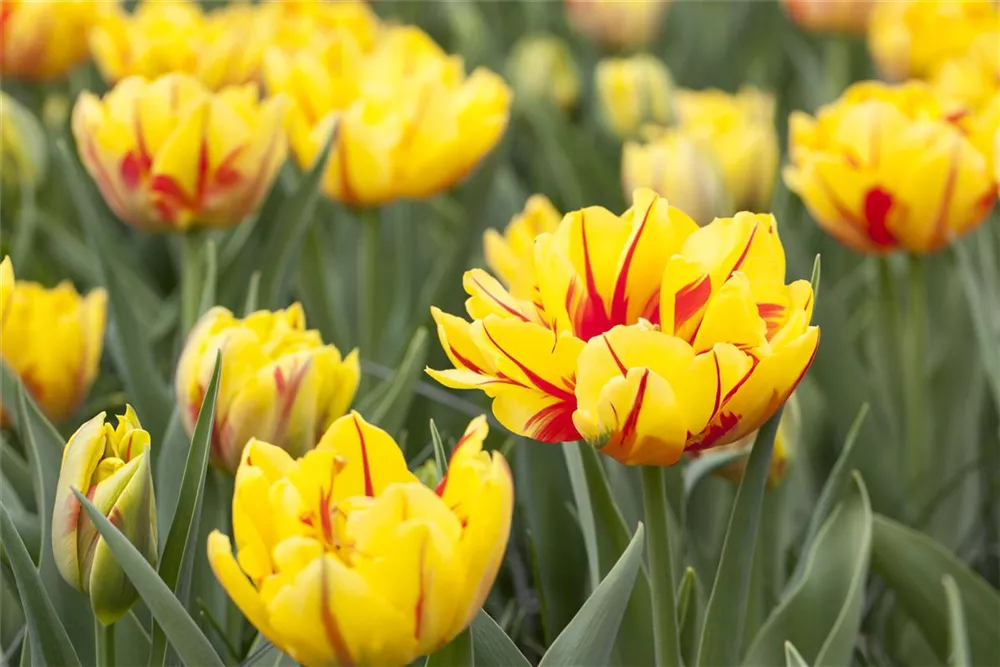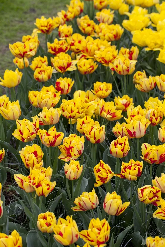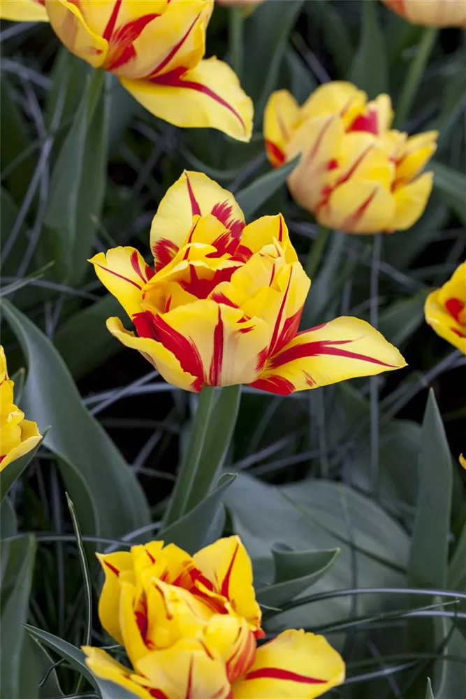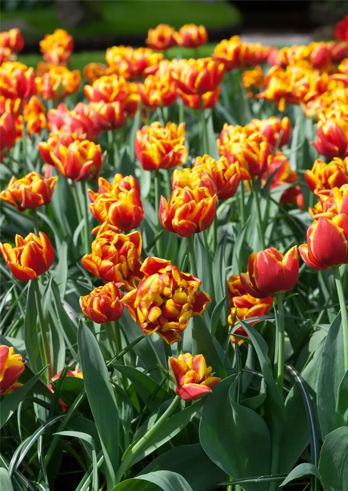 Ab April lässt die Gefüllte frühe Tulpe 'Monsella' ihre gefüllten Blüten in Gelb-rot erstrahlen und ihren angenehmen Duft verbreiten.