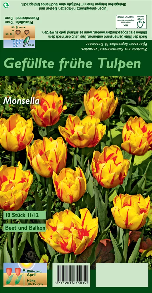 Welch eine Pracht, wenn die Gefüllte frühe Tulpe 'Monsella' ab April ihre herrlichen, gelb-roten Blüten hervorbringt! Das Besondere: sie sind gefüllt und verbreiten einen angenehmen Duft. Über den dunkelgrünen, linealen Blättern kommen die Blüten besonders gut zur Geltung. Wird Tulipa 'Monsella' an einen sonnigen Standort mit lockerem und sandigem Boden gepflanzt, entwickelt sie sich besonders gut. Sie wächst aufrecht, schlank und erreicht Größen von 20 cm bis 30 cm bei einer Breite von 8 cm bis 10 cm. Sehr dekorativ macht sich die Gefüllte frühe Tulpe 'Monsella' auch in Kübeln oder Kästen. Tulipa 'Monsella' hat sich als besonders pflegeleicht erwiesen.