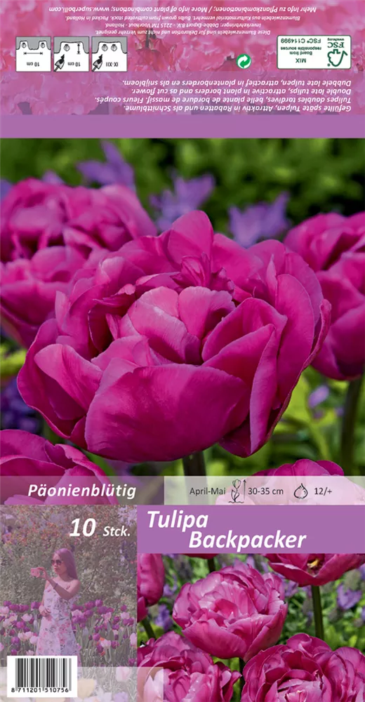 Welch eine Pracht, wenn die Gefüllte Späte Tulpe 'Backpacker' ab April ihre herrlichen, violetten Blüten hervorbringt! Das Besondere: sie sind gefüllt und verbreiten einen angenehmen Duft. Über den dunkelgrünen, linealen Blättern kommen die Blüten besonders gut zur Geltung. Wird Tulipa 'Backpacker' an einen sonnigen Standort mit lockerem und sandigem Boden gepflanzt, entwickelt sie sich besonders gut. Sie wächst aufrecht, schlank und erreicht Größen von 30 cm bis 35 cm bei einer Breite von 8 cm bis 10 cm. Sehr dekorativ macht sich die Gefüllte Späte Tulpe 'Backpacker' auch in Kübeln oder Kästen. Tulipa 'Backpacker' hat sich als besonders pflegeleicht erwiesen.